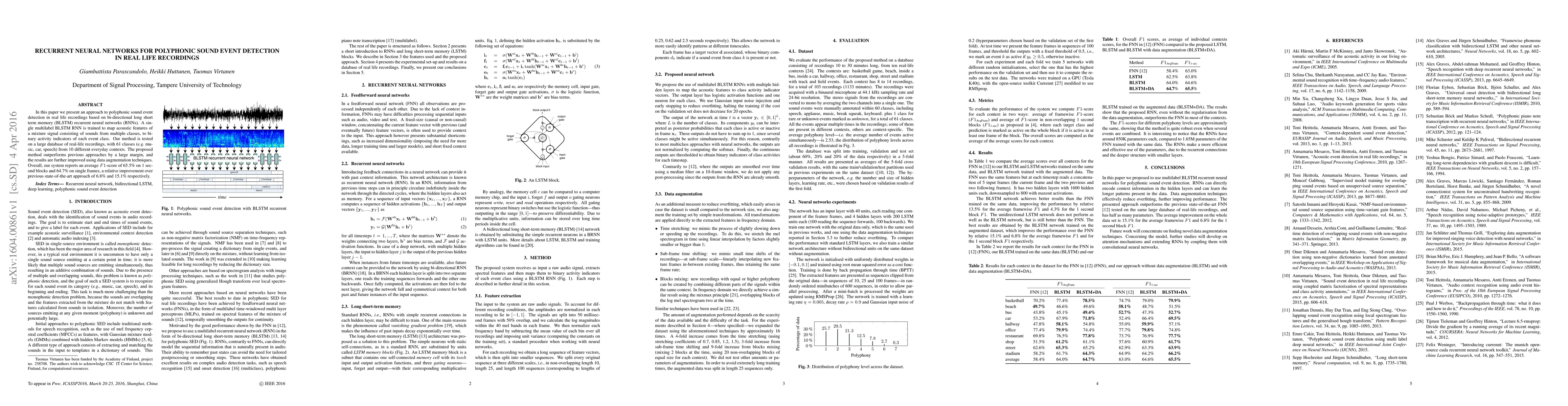 This paper introduces a bi-directional LSTM RNN for detecting polyphonic sound events in real-life recordings, achieving superior performance over previous methods. The system reports an average F1-score improvement of 6.8% on 1-second blocks and 15.1% on single frames.