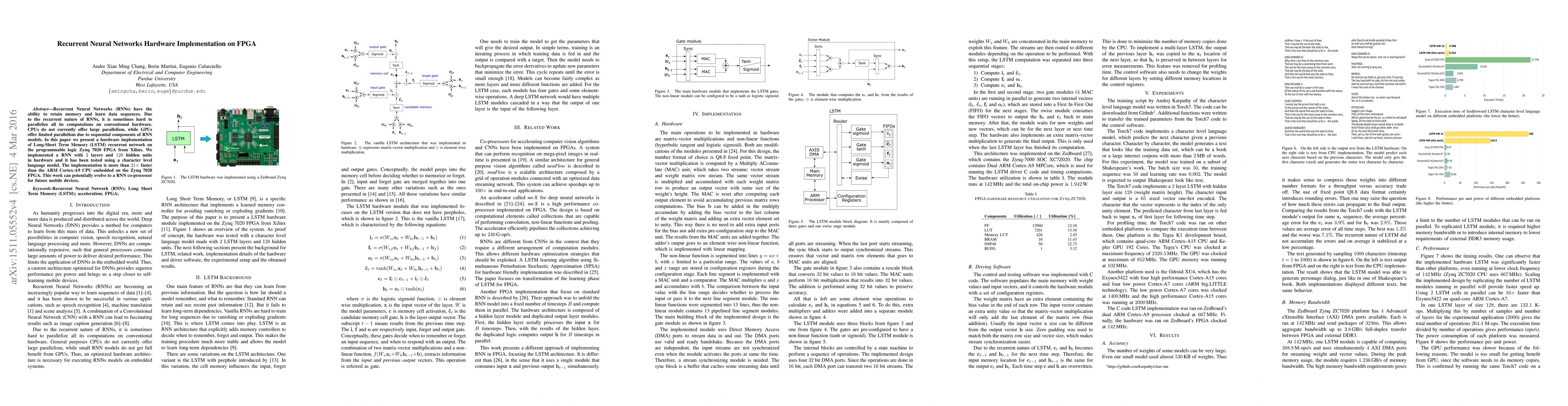 Recurrent Neural Networks (RNNs) have the ability to retain memory and learn data sequences. Due to the recurrent nature of RNNs, it is sometimes hard to parallelize all its computations on conventional hardware. CPUs do not currently offer large parallelism, while GPUs offer limited parallelism due to sequential components of RNN models. In this paper we present a hardware implementation of Long-Short Term Memory (LSTM) recurrent network on the programmable logic Zynq 7020 FPGA from Xilinx. We implemented a RNN with $2$ layers and $128$ hidden units in hardware and it has been tested using a character level language model. The implementation is more than $21\times$ faster than the ARM CPU embedded on the Zynq 7020 FPGA. This work can potentially evolve to a RNN co-processor for future mobile devices.