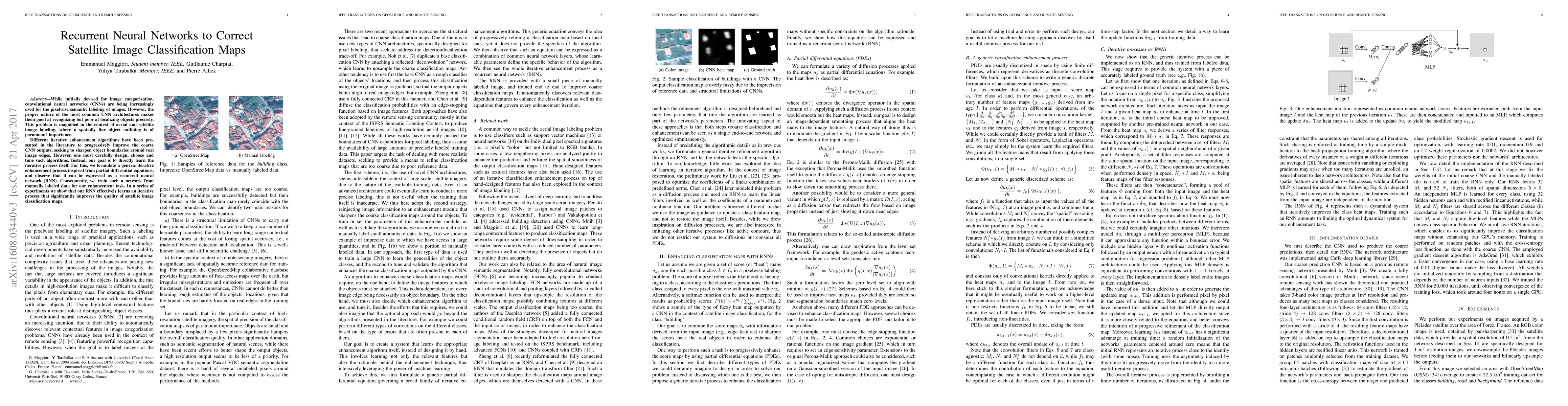 Researchers developed a Recurrent Neural Network to improve the accuracy of satellite image classification maps by learning an iterative enhancement process that sharpens object boundaries. This approach outperforms existing methods in enhancing CNN outputs for localizing objects precisely.