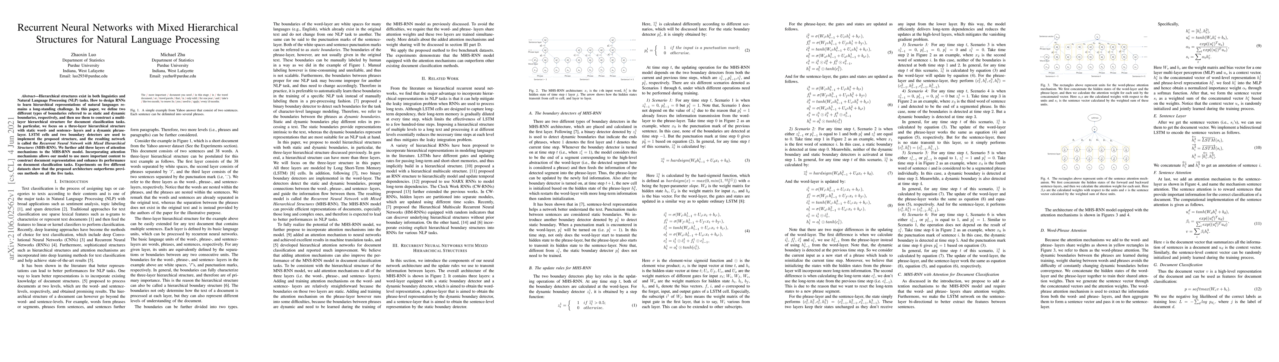 Researchers developed a new neural network architecture called MHS-RNN that combines hierarchical structures to improve natural language processing tasks, achieving better performance on document classification than previous methods.