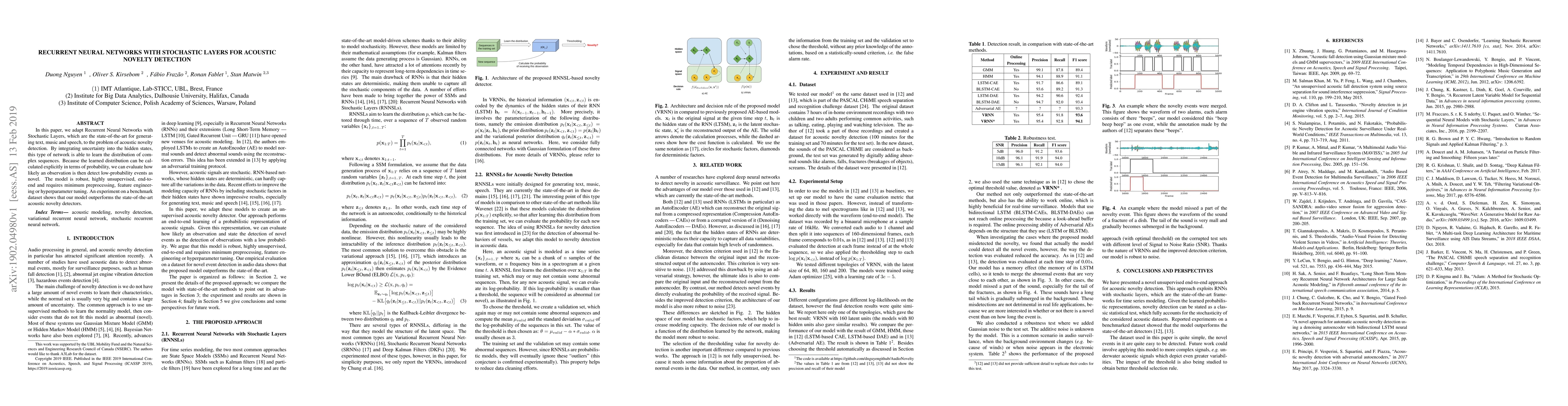 In this paper, we adapt Recurrent Neural Networks with Stochastic Layers, which are the state-of-the-art for generating text, music and speech, to the problem of acoustic novelty detection. By integrating uncertainty into the hidden states, this type of network is able to learn the distribution of complex sequences. Because the learned distribution can be calculated explicitly in terms of probability, we can evaluate how likely an observation is then detect low-probability events as novel. The model is robust, highly unsupervised, end-to-end and requires minimum preprocessing, feature engineering or hyperparameter tuning. An experiment on a benchmark dataset shows that our model outperforms the state-of-the-art acoustic novelty detectors.
