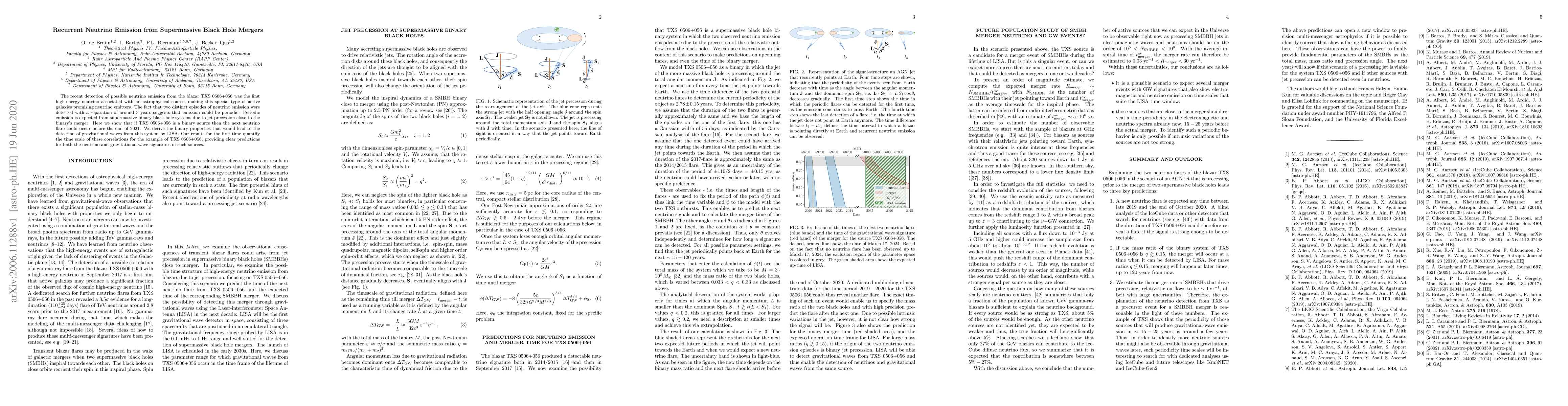This paper investigates the possibility of recurrent neutrino emission from supermassive black hole mergers, using the blazar TXS 0506+056 as a case study. It predicts the next neutrino flare could occur before the end of 2021 if the blazar is a binary source, and quantifies the time scale for these correlations, providing predictions for both neutrino and gravitational-wave signatures.