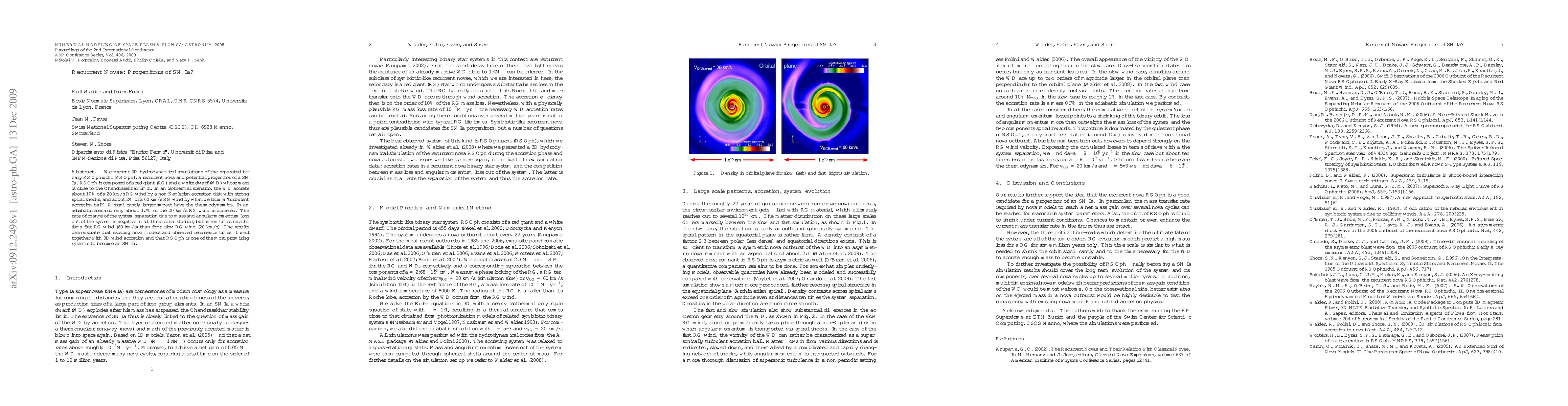 We present 3D hydrodynamical simulations of the separated binary RS Ophiuchi (RS Oph), a recurrent nova and potential progenitor of a SN Ia. RS Oph is composed of a red giant (RG) and a white dwarf (WD) whose mass is close to the Chandrasekhar limit. In an isothermal scenario, the WD accrets about 10% of a 20 km/s RG wind by a non-Keplerian accretion disk with strong spiral shocks, and about 2% of a 60 km/s RG wind by what we term a 'turbulent accretion ball'. A significantly larger impact have the thermodynamics. In an adiabatic scenario only about 0.7% of the 20 km/s RG wind is accreted. The rate of change of the system separation due to mass and angular momentum loss out of the system is negative in all three cases studied, but is ten times smaller for a fast RG wind (60 km/s) than for a slow RG wind (20 km/s). The results demonstrate that existing nova models and observed recurrence times fit well together with 3D wind accretion and that RS Oph is one of the most promising systems to become an SN Ia.