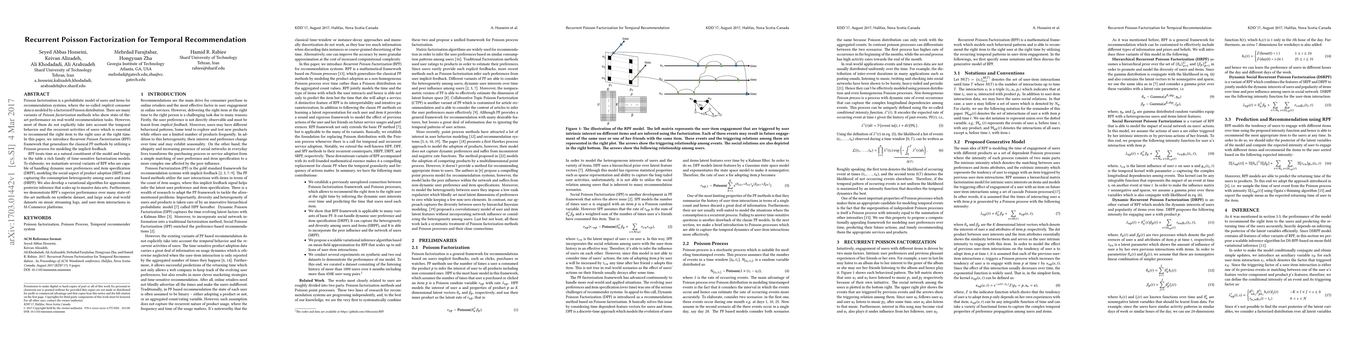 This paper introduces Recurrent Poisson Factorization (RPF), a framework that extends classical Poisson factorization to incorporate temporal dynamics in recommendation systems. RPF models implicit feedback using a Poisson process and demonstrates superior performance on real-world datasets, outperforming state-of-the-art methods.