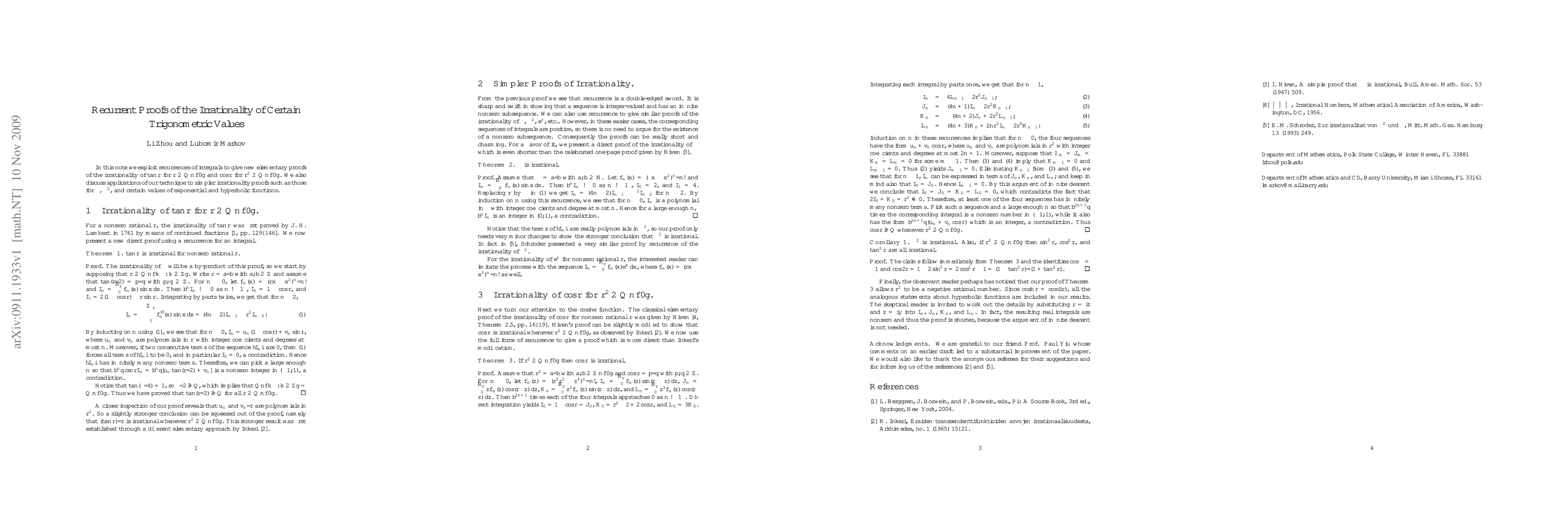 We use recurrences of integrals to give new and elementary proofs of the irrationality of pi, tan(r) for all nonzero rational r, and cos(r) for all nonzero rational r^2. Immediate consequences to other values of the elementary transcendental functions are also discussed.