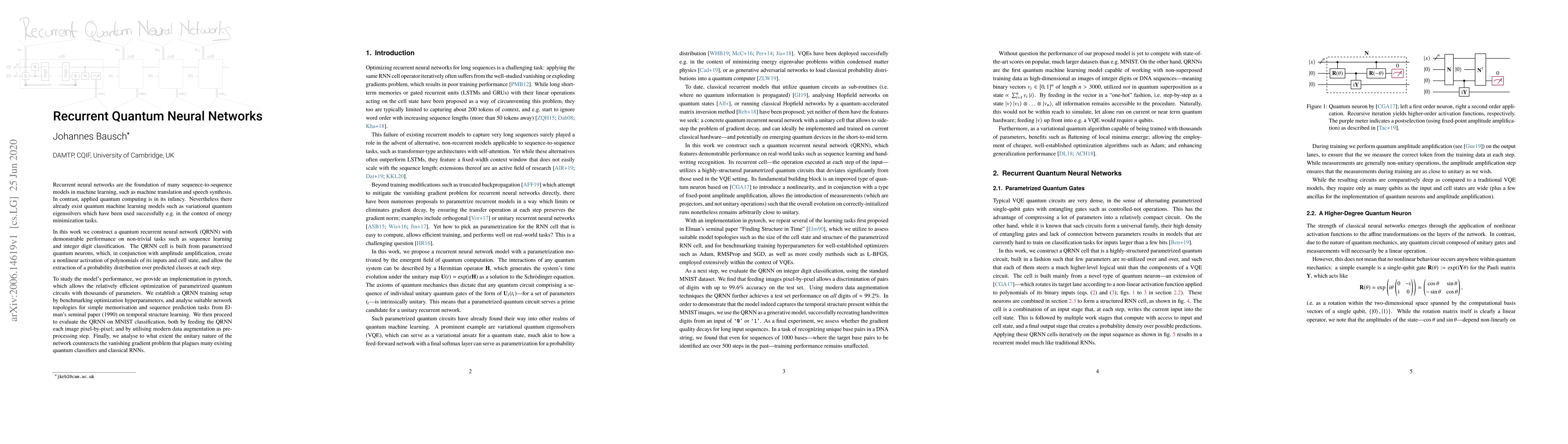 Recurrent neural networks are the foundation of many sequence-to-sequence models in machine learning, such as machine translation and speech synthesis. In contrast, applied quantum computing is in its infancy. Nevertheless there already exist quantum machine learning models such as variational quantum eigensolvers which have been used successfully e.g. in the context of energy minimization tasks. In this work we construct a quantum recurrent neural network (QRNN) with demonstrable performance on non-trivial tasks such as sequence learning and integer digit classification. The QRNN cell is built from parametrized quantum neurons, which, in conjunction with amplitude amplification, create a nonlinear activation of polynomials of its inputs and cell state, and allow the extraction of a probability distribution over predicted classes at each step. To study the model's performance, we provide an implementation in pytorch, which allows the relatively efficient optimization of parametrized quantum circuits with thousands of parameters. We establish a QRNN training setup by benchmarking optimization hyperparameters, and analyse suitable network topologies for simple memorisation and sequence prediction tasks from Elman's seminal paper (1990) on temporal structure learning. We then proceed to evaluate the QRNN on MNIST classification, both by feeding the QRNN each image pixel-by-pixel; and by utilising modern data augmentation as preprocessing step. Finally, we analyse to what extent the unitary nature of the network counteracts the vanishing gradient problem that plagues many existing quantum classifiers and classical RNNs.