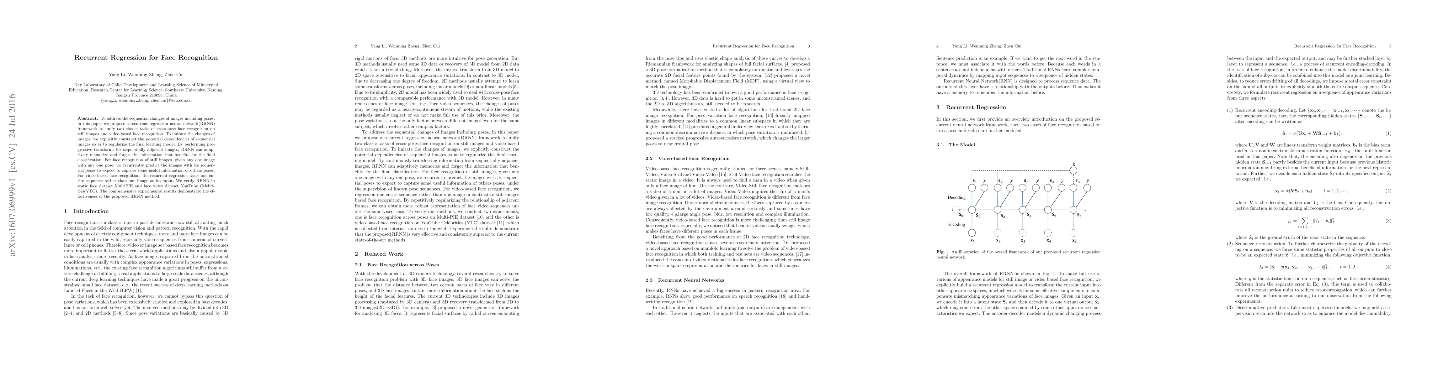 This paper proposes a recurrent regression neural network (RRNN) framework to improve face recognition accuracy for still images and videos, capturing sequential changes in poses through progressive transforms and regularization.