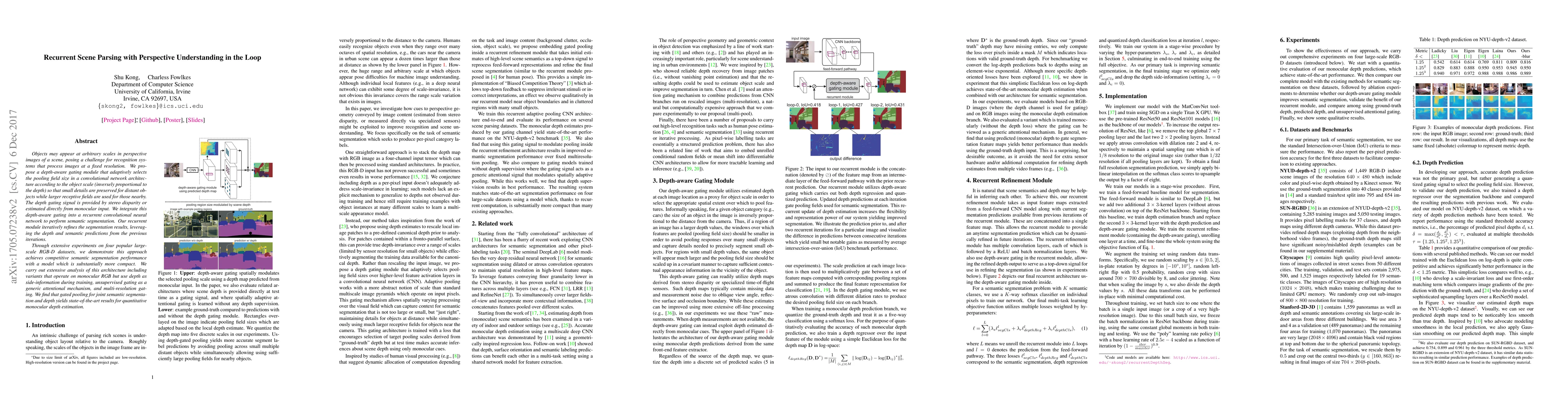 The paper introduces a depth-aware gating module for recurrent convolutional neural networks to adaptively adjust pooling fields based on object scale and distance in perspective images. This method, tested on RGB-D datasets, achieves competitive semantic segmentation with a more compact model. It also demonstrates state-of-the-art performance in monocular depth estimation, and explores variants for monocular RGB use, unsupervised gating, and multi-resolution gating.