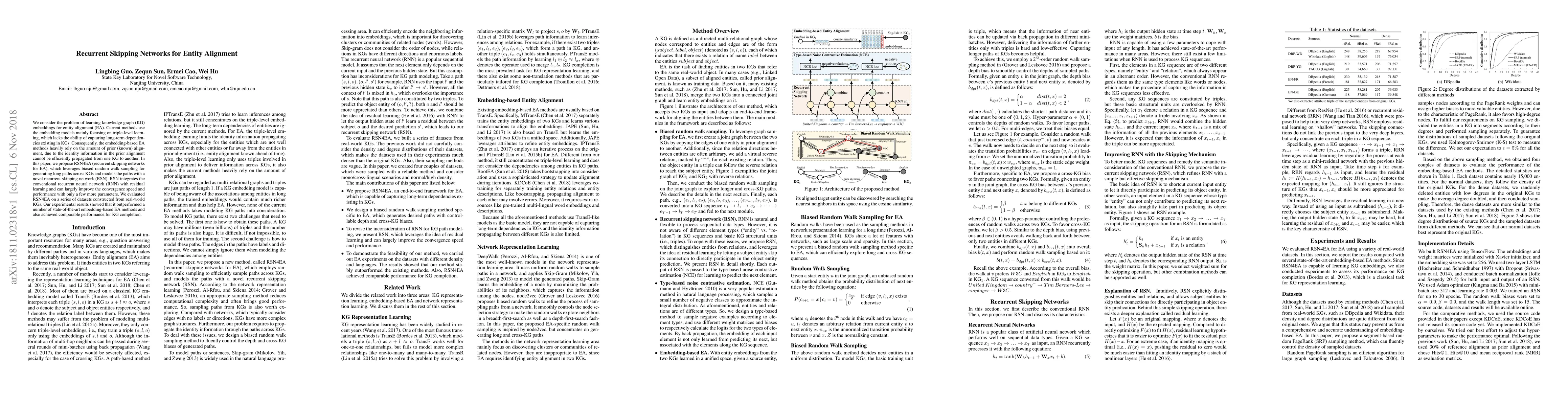 Researchers propose a new method called Recurrent Skipping Networks for Entity Alignment that improves knowledge graph embeddings by leveraging long paths across graphs and achieving comparable performance to existing methods.
