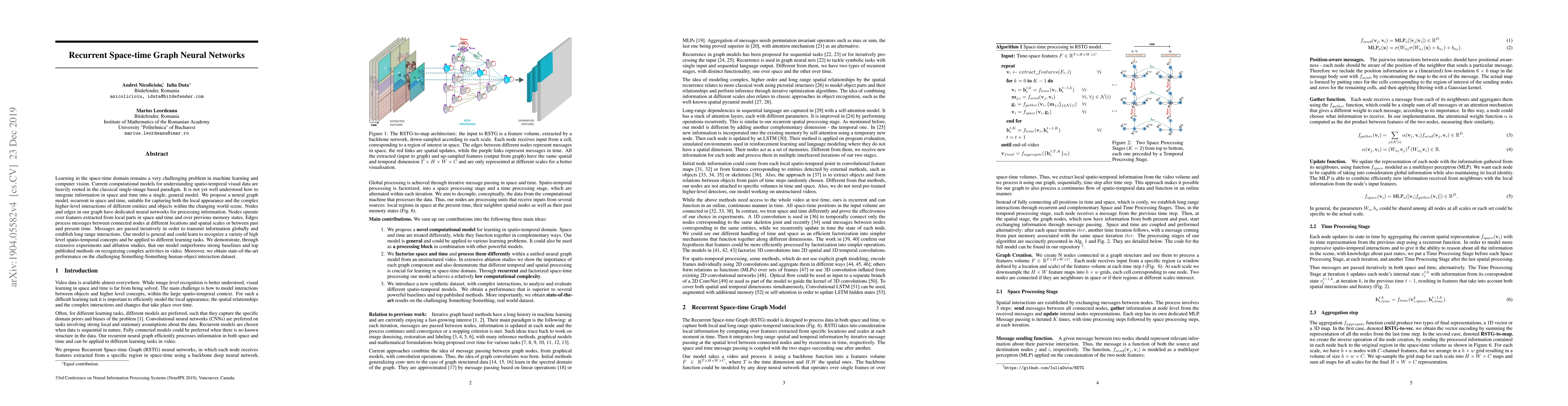 Learning in the space-time domain remains a very challenging problem in machine learning and computer vision. Current computational models for understanding spatio-temporal visual data are heavily rooted in the classical single-image based paradigm. It is not yet well understood how to integrate information in space and time into a single, general model. We propose a neural graph model, recurrent in space and time, suitable for capturing both the local appearance and the complex higher-level interactions of different entities and objects within the changing world scene. Nodes and edges in our graph have dedicated neural networks for processing information. Nodes operate over features extracted from local parts in space and time and previous memory states. Edges process messages between connected nodes at different locations and spatial scales or between past and present time. Messages are passed iteratively in order to transmit information globally and establish long range interactions. Our model is general and could learn to recognize a variety of high level spatio-temporal concepts and be applied to different learning tasks. We demonstrate, through extensive experiments and ablation studies, that our model outperforms strong baselines and top published methods on recognizing complex activities in video. Moreover, we obtain state-of-the-art performance on the challenging Something-Something human-object interaction dataset.