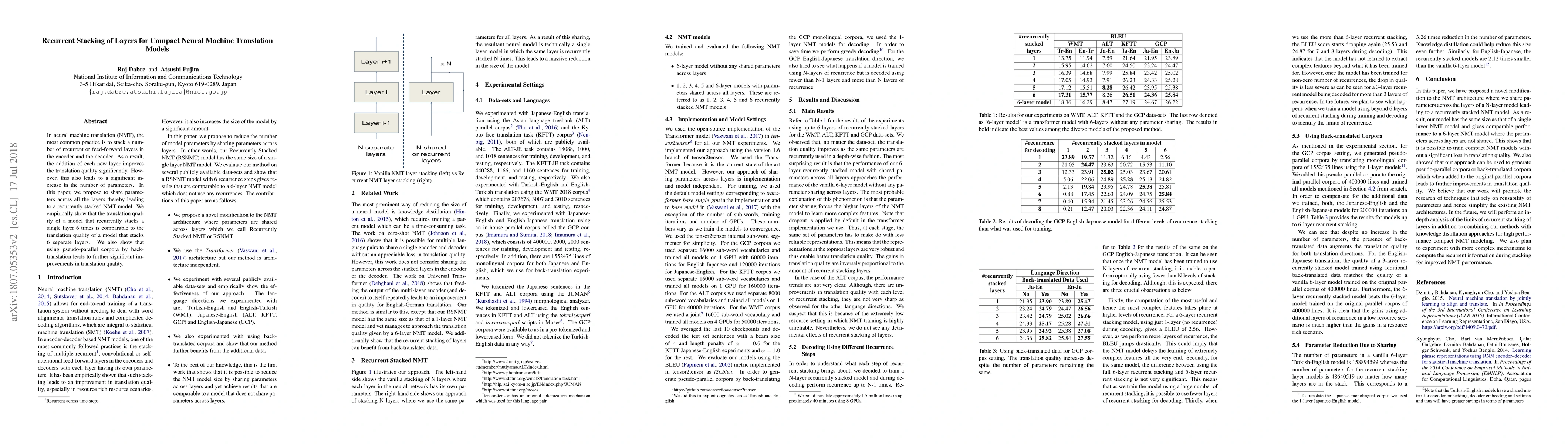 This paper proposes a recurrently stacked neural machine translation model that shares parameters across layers to reduce parameter count while maintaining translation quality. The study finds that this approach is as effective as stacking multiple layers separately, and it further improves performance using back-translation with pseudo-parallel corpora.