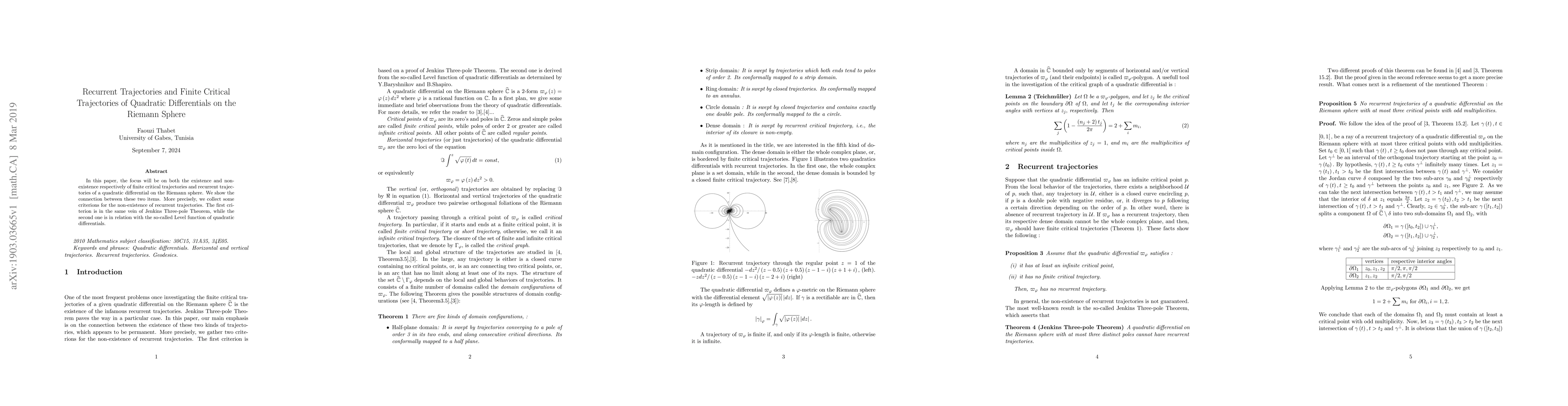 In this paper, the focus will be on both the existence and non-existence respectively of finite critical trajectories and recurrent trajectories of a quadratic differential on the Riemann sphere. We show the connection between these two items. More precisely, we collect some criterions for the non-existence of recurrent trajectories. The first criterion is in the same vein of Jenkins Three-pole Theorem, while the second one is in relation with the so-called Level function of quadratic differentials.
