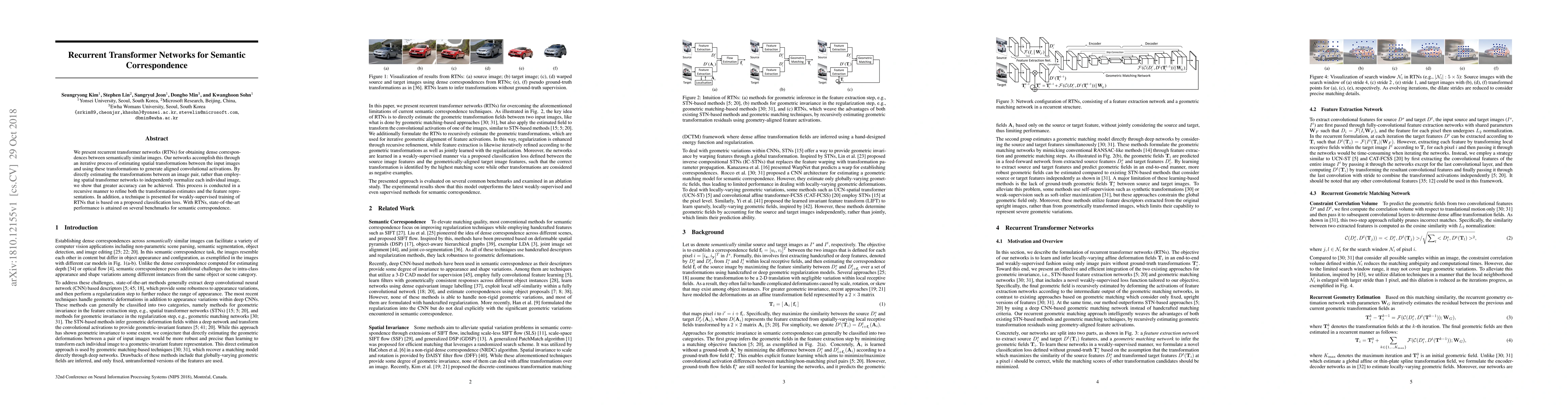 This paper introduces recurrent transformer networks (RTNs) for achieving dense correspondences between semantically similar images through iterative spatial transformation estimation and feature alignment, achieving higher accuracy than traditional methods. The RTNs also utilize a weakly-supervised training technique based on a classification loss, resulting in state-of-the-art performance on semantic correspondence benchmarks.