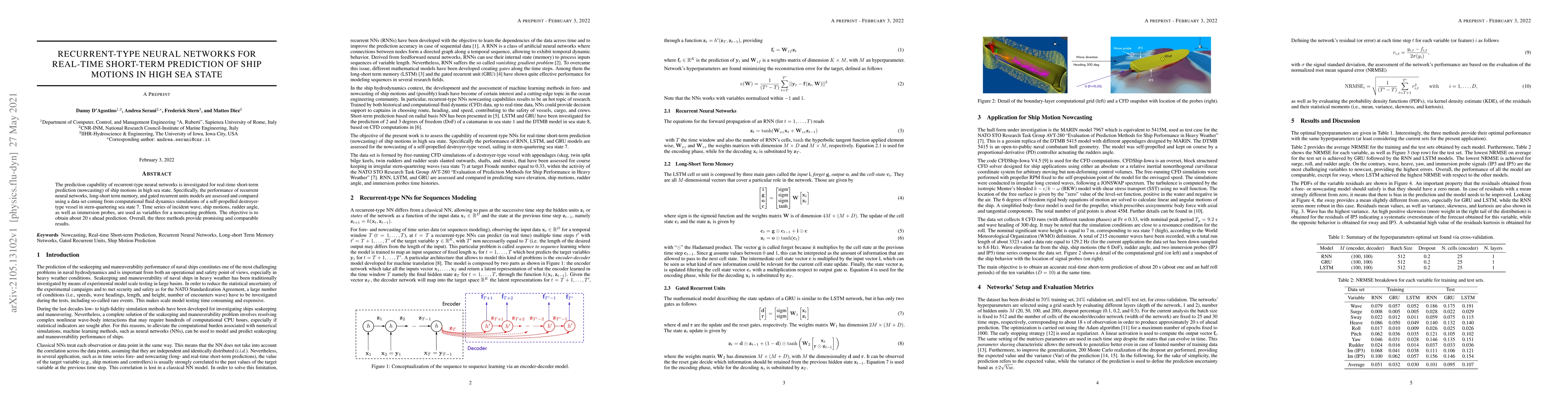 This study evaluates the use of recurrent neural networks, long-short term memory, and gated recurrent units for real-time short-term prediction of ship motions in high sea states, showing comparable and promising results for 20-second ahead forecasts based on incident wave data and ship dynamics.