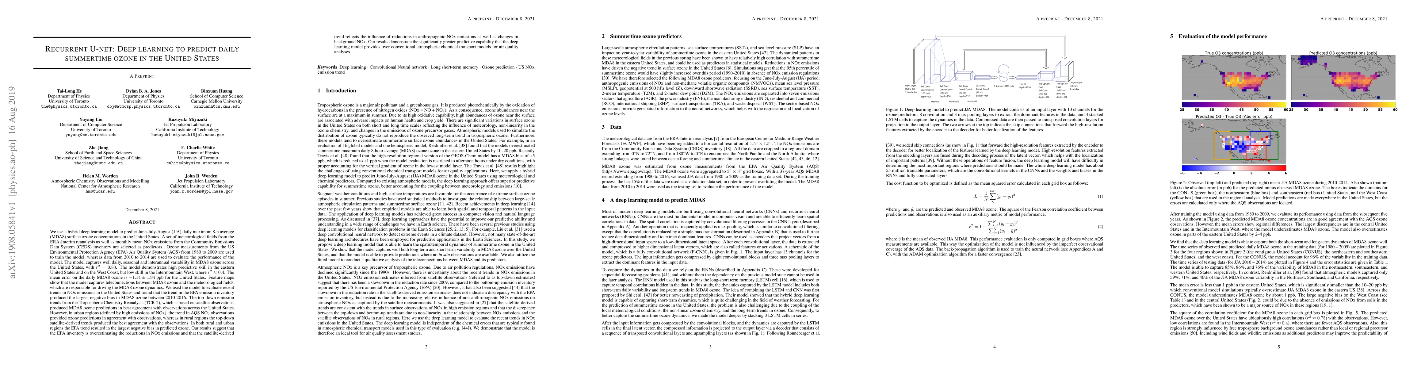 This paper employs a hybrid deep learning model, specifically Recurrent U-net, to predict daily summertime ozone levels in the US using meteorological and NO$_x$ emission data. The model shows strong performance in capturing ozone variability and suggests that satellite-derived emission trends better reflect actual reductions in NO$_x$ emissions compared to the EPA inventory.