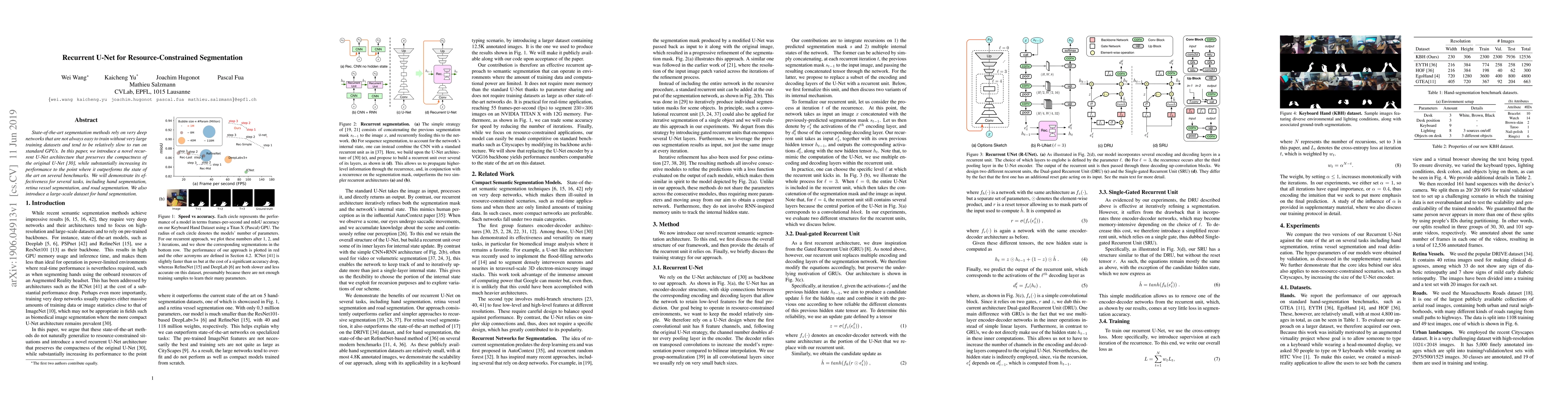 State-of-the-art segmentation methods rely on very deep networks that are not always easy to train without very large training datasets and tend to be relatively slow to run on standard GPUs. In this paper, we introduce a novel recurrent U-Net architecture that preserves the compactness of the original U-Net, while substantially increasing its performance to the point where it outperforms the state of the art on several benchmarks. We will demonstrate its effectiveness for several tasks, including hand segmentation, retina vessel segmentation, and road segmentation. We also introduce a large-scale dataset for hand segmentation.