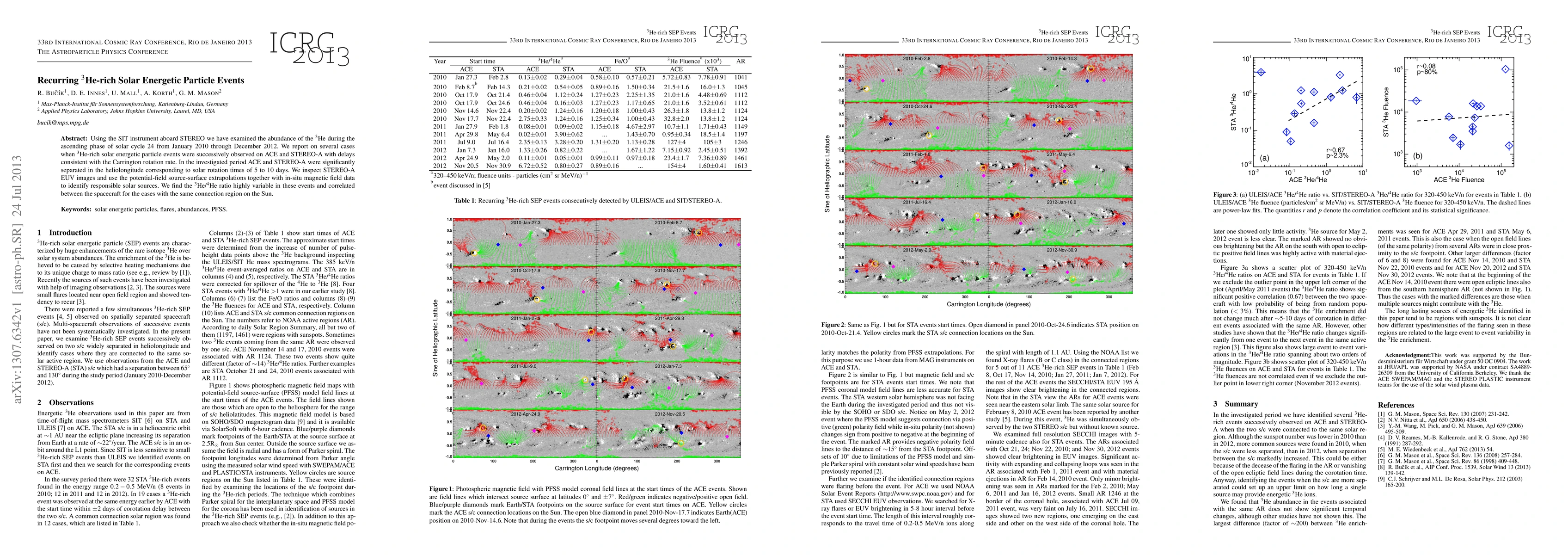 This study investigates recurring 3He-rich solar energetic particle events observed by ACE and STEREO-A during solar cycle 24, finding consistent delays and variable 3He/4He ratios correlated between the spacecraft, suggesting a common solar source. The research uses STEREO-A EUV images and magnetic field data to identify the solar origins of these events.