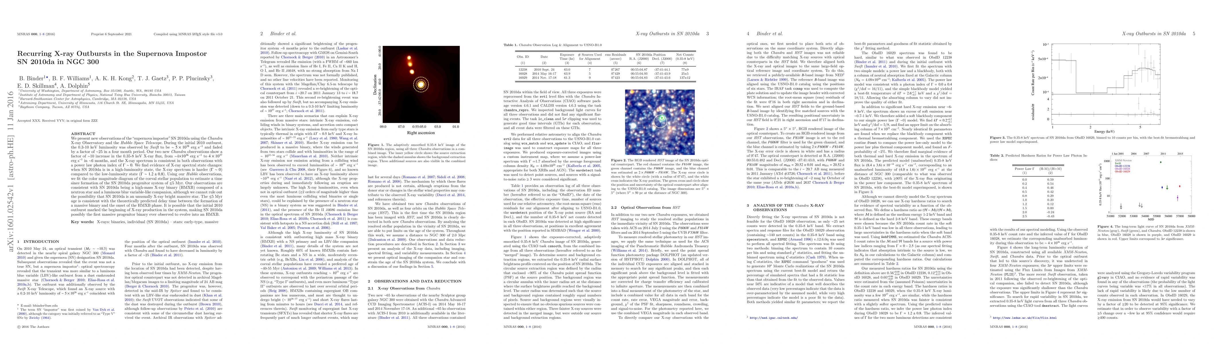 The research on SN 2010da, a supernova impostor in NGC 300, reveals recurring X-ray outbursts using Chandra and Hubble observations. The X-ray luminosity increased by a factor of ~10 in 6 months, with spectral state changes indicating a high-mass X-ray binary (HMXB) system. The progenitor's age is estimated to be less than 5 Myr, suggesting it might be the first observed binary evolving into an HMXB.