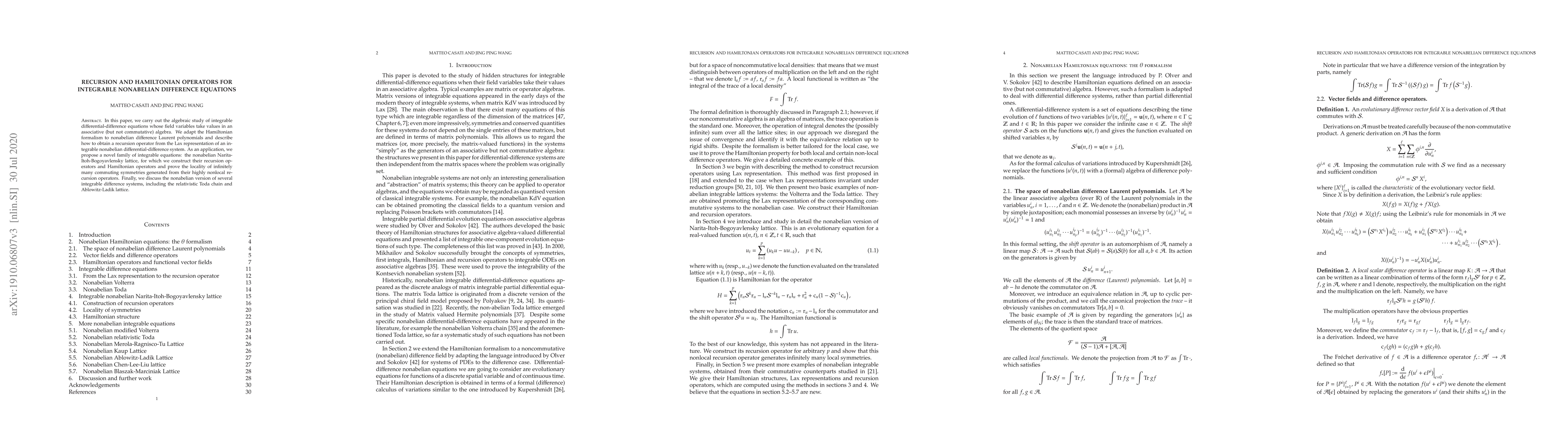 The work introduces a new family of integrable nonabelian difference equations and demonstrates the construction of recursion operators and Hamiltonian structures for them, extending previous research on integrable systems.