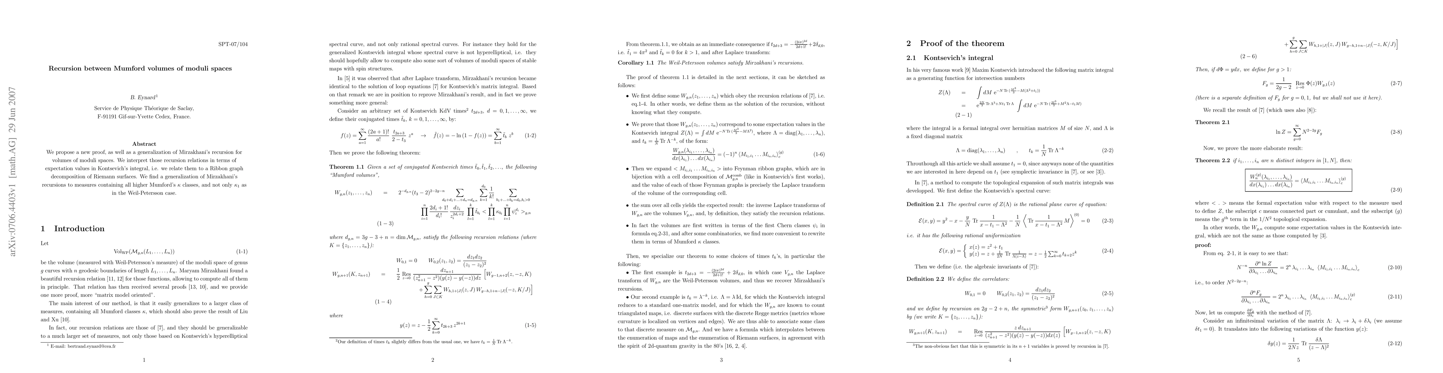 We propose a new proof, as well as a generalization of Mirzakhani's recursion for volumes of moduli spaces. We interpret those recursion relations in terms of expectation values in Kontsevich's integral, i.e. we relate them to a Ribbon graph decomposition of Riemann surfaces. We find a generalization of Mirzakhani's recursions to measures containing all higher Mumford's kappa classes, and not only kappa1 as in the Weil-Petersson case.