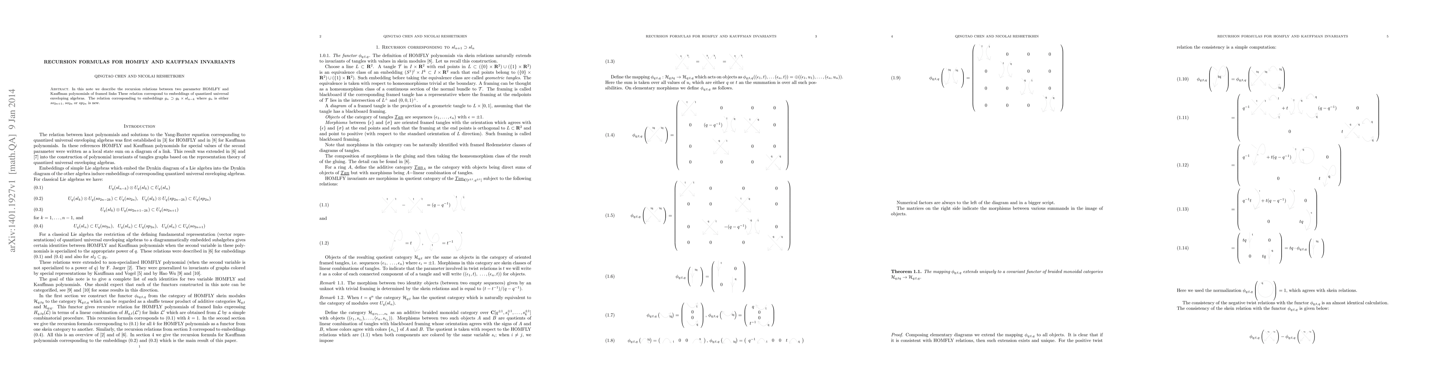In this note we describe the recursion relations between two parameter HOMLFY and Kauffman polynomials of framed links These relation correspond to embeddings of quantized universal enveloping algebras. The relation corresponding to embeddings $g_{n}\supset g_{k}\times sl_{n-k}$ where $g_{n}$ is either $so_{2n+1}$, $so_{2n}$ or $sp_{2n}$ is new.