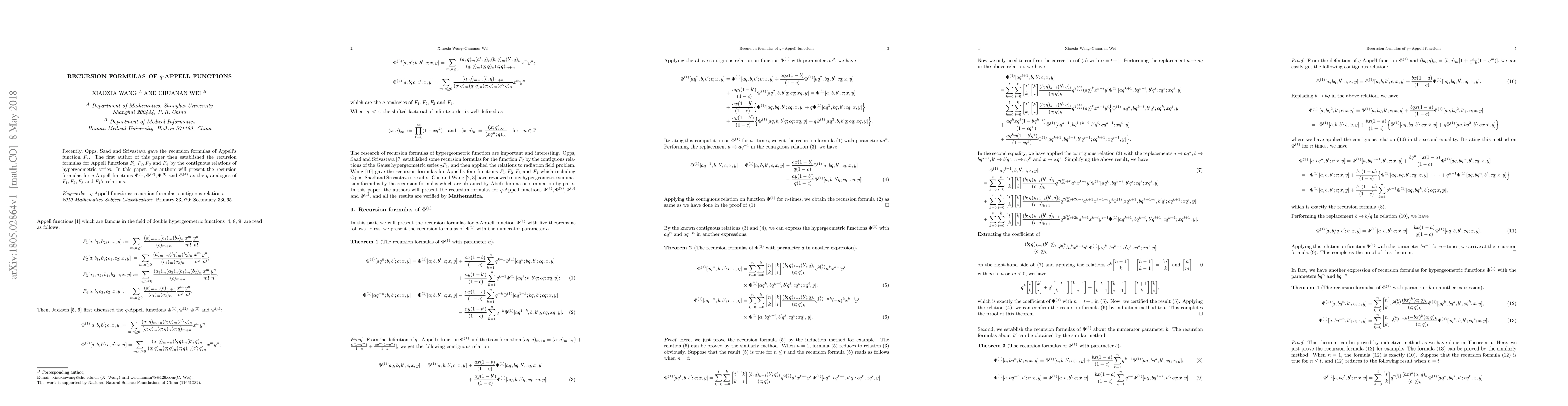 This paper presents recursion formulas for q-Appell functions $\Phi^{(1)}, \Phi^{(2)}, \Phi^{(3)}$ and $\Phi^{(4)}$, which are q-analogues of the classical Appell functions F1, F2, F3, and F4. These formulas are derived using contiguous relations of hypergeometric series.