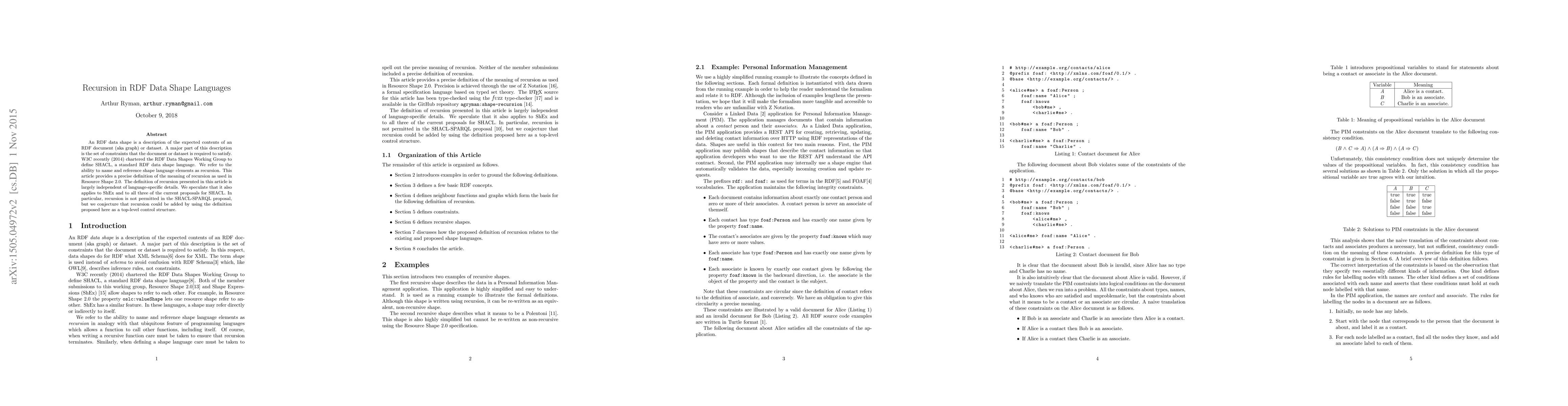 An RDF data shape is a description of the expected contents of an RDF document (aka graph) or dataset. A major part of this description is the set of constraints that the document or dataset is required to satisfy. W3C recently (2014) chartered the RDF Data Shapes Working Group to define SHACL, a standard RDF data shape language. We refer to the ability to name and reference shape language elements as recursion. This article provides a precise definition of the meaning of recursion as used in Resource Shape 2.0. The definition of recursion presented in this article is largely independent of language-specific details. We speculate that it also applies to ShEx and to all three of the current proposals for SHACL. In particular, recursion is not permitted in the SHACL-SPARQL proposal, but we conjecture that recursion could be added by using the definition proposed here as a top-level control structure.