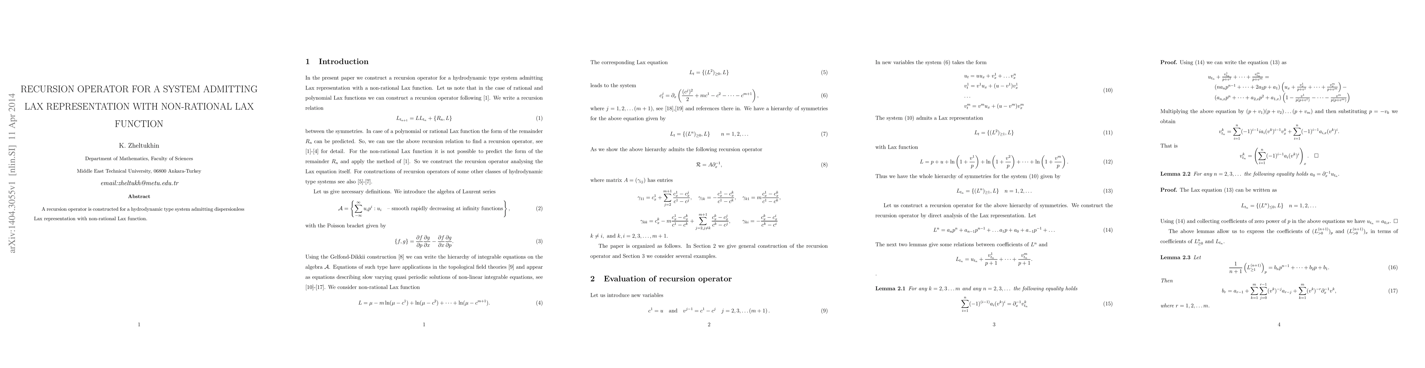 Summary: This paper constructs a recursion operator for a hydrodynamic type system that has a dispersionless Lax representation with a non-rational Lax function, providing a new tool for analyzing such systems.