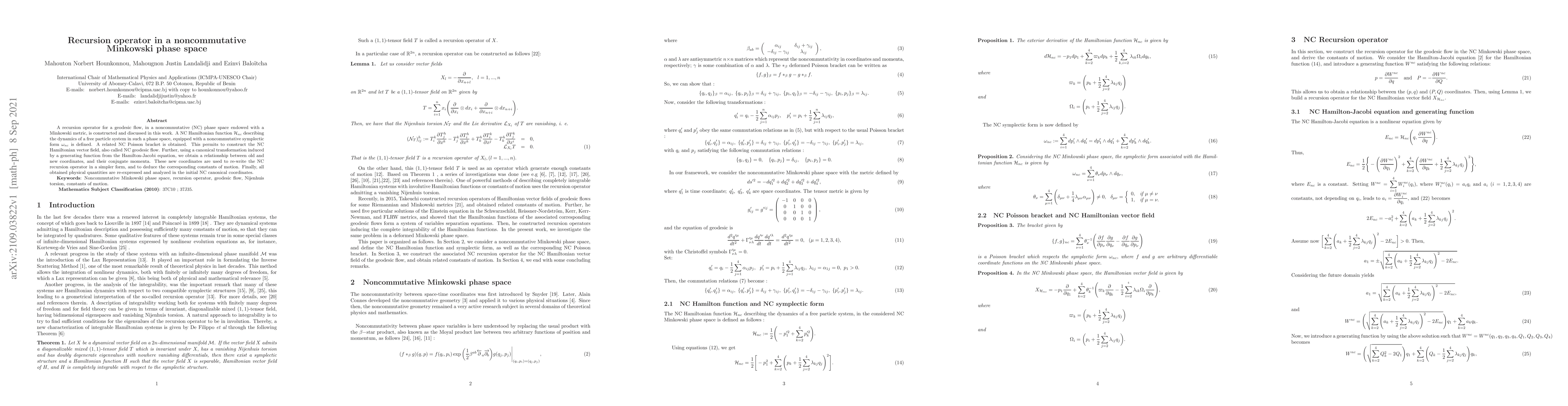 This paper constructs a recursion operator for the geodesic flow in a noncommutative Minkowski phase space, defining a noncommutative Hamiltonian function and symplectic form. It derives constants of motion and simplifies the recursion operator using a canonical transformation, ultimately analyzing all physical quantities in the initial coordinates.