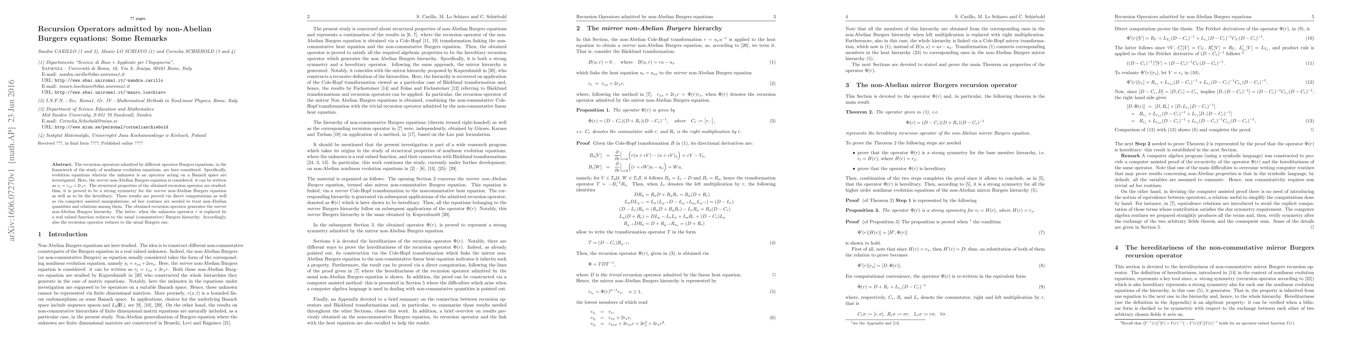 The recursion operators admitted by different operator Burgers equations, in the framework of the study of nonlinear evolution equations, are here con- sidered. Specifically, evolution equations wherein the unknown is an operator acting on a Banach space are investigated. Here, the mirror non-Abelian Burgers equation is considered: it can be written as $r_t = r_{xx} + 2r_x r$. The structural properties of the admitted recursion operator are studied; thus, it is proved to be a strong symmetry for the mirror non-Abelian Burgers equation as well as to be the hereditary. These results are proved via direct computations as well as via computer assisted manipulations; ad hoc routines are needed to treat non-Abelian quantities and relations among them. The obtained recursion operator generates the $mirror$ non-Abelian Burgers hierarchy. The latter, when the unknown operator $r$ is replaced by a real valued function reduces to the usual (commutative) Burgers hierarchy. Accordingly, also the recursion operator reduces to the usual Burgers one.