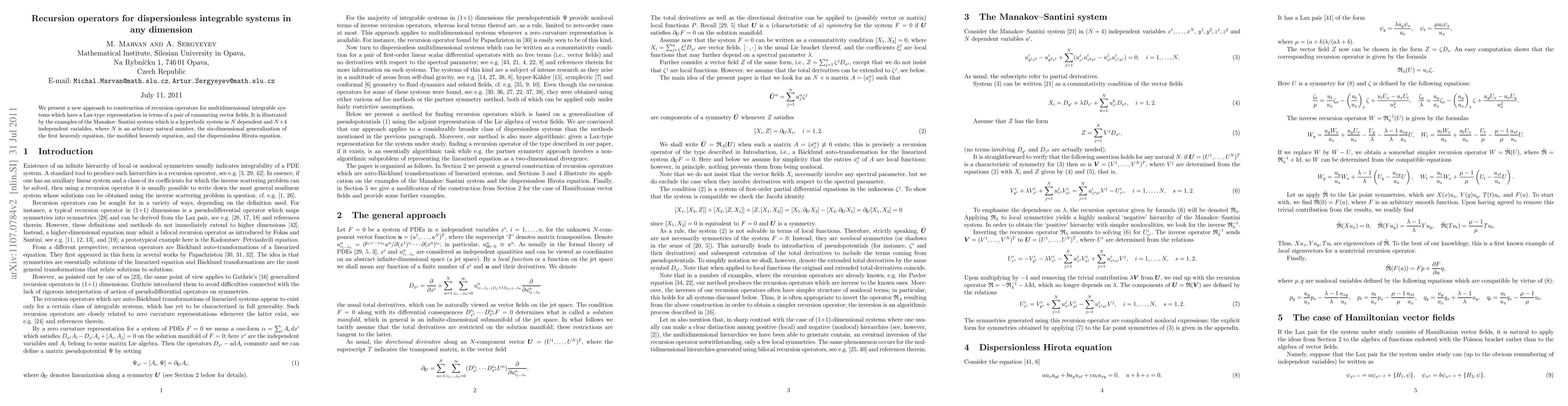 This paper introduces a novel method for constructing recursion operators for multidimensional integrable systems represented by commuting vector fields, exemplified by the Manakov-Santini system and other dispersionless integrable models. The approach is demonstrated across various systems including hyperbolic and modified heavenly equations.