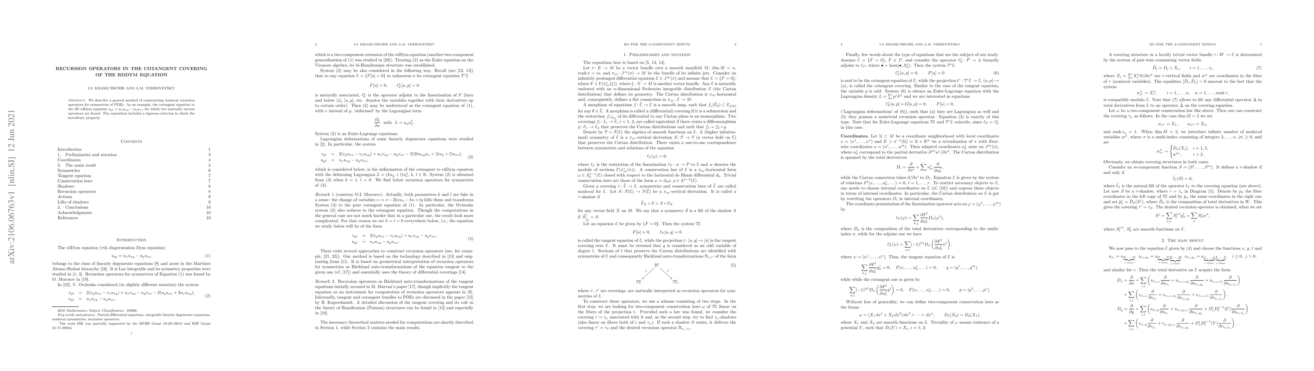 This paper presents a method for constructing nonlocal recursion operators for symmetries of partial differential equations, exemplified by the cotangent covering of the 3D rdDym equation, where two mutually inverse operators are identified and a criterion for verifying their hereditary property is provided.