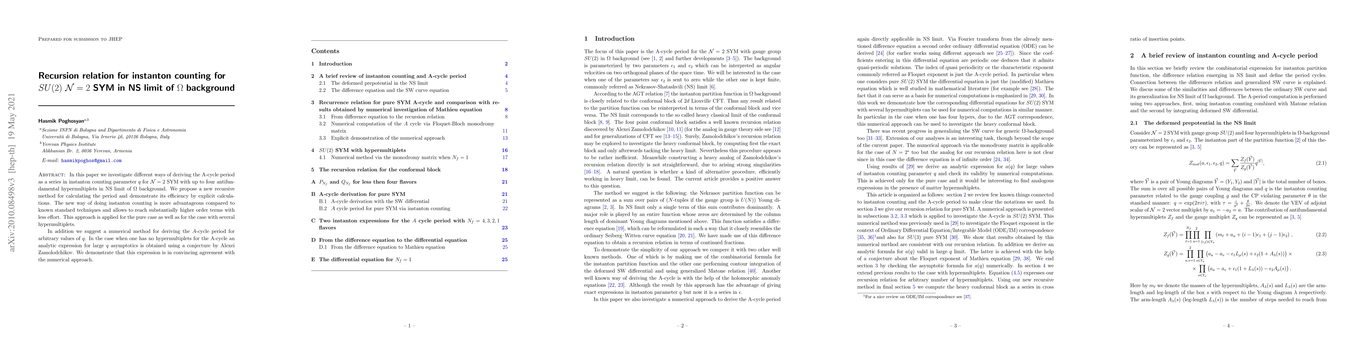 In this paper we investigate different ways of deriving the A-cycle period as a series in instanton counting parameter $q$ for ${\cal N}=2$ SYM with up to four antifundamental hypermultiplets in NS limit of $\Omega$ background. We propose a new method for calculating the period and demonstrate its efficiency by explicit calculations. The new way of doing instanton counting is more advantageous compared to known standard techniques and allows to reach substantially higher order terms with less effort. This approach is applied for the pure case as well as for the case with several hypermultiplets. We also investigate a numerical method for deriving the $A$-cycle period valid for arbitrary values of $q$. Analyzing large $q$ asymptotic we get convincing agreement with an analytic expression deduced from a conjecture by Alexei Zamolodchikov in a different context.