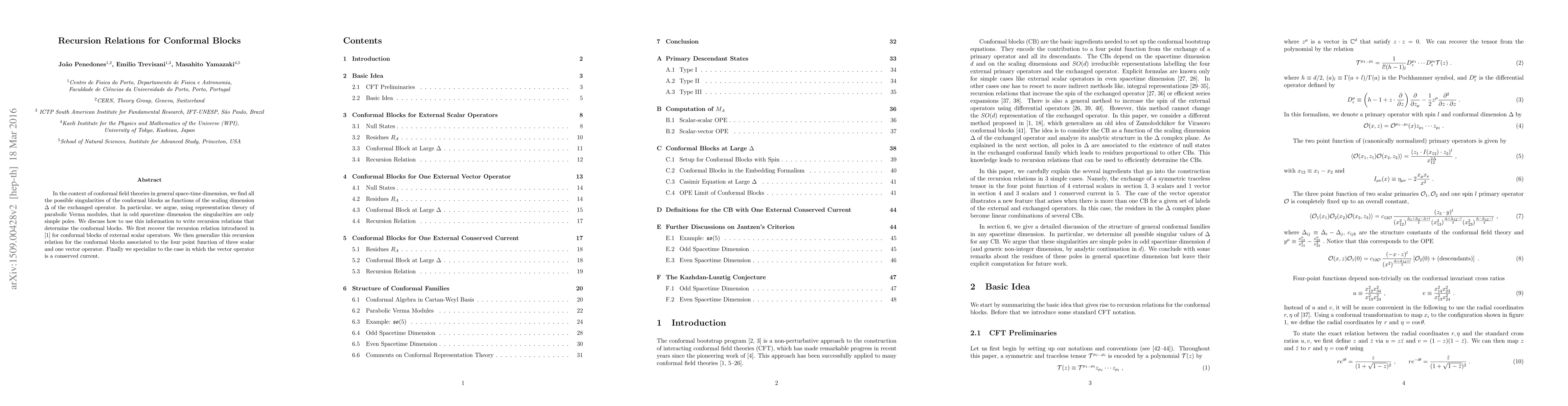 In the context of conformal field theories in general space-time dimension, we find all the possible singularities of the conformal blocks as functions of the scaling dimension $\Delta$ of the exchanged operator. In particular, we argue, using representation theory of parabolic Verma modules, that in odd spacetime dimension the singularities are only simple poles. We discuss how to use this information to write recursion relations that determine the conformal blocks. We first recover the recursion relation introduced in 1307.6856 for conformal blocks of external scalar operators. We then generalize this recursion relation for the conformal blocks associated to the four point function of three scalar and one vector operator. Finally we specialize to the case in which the vector operator is a conserved current.