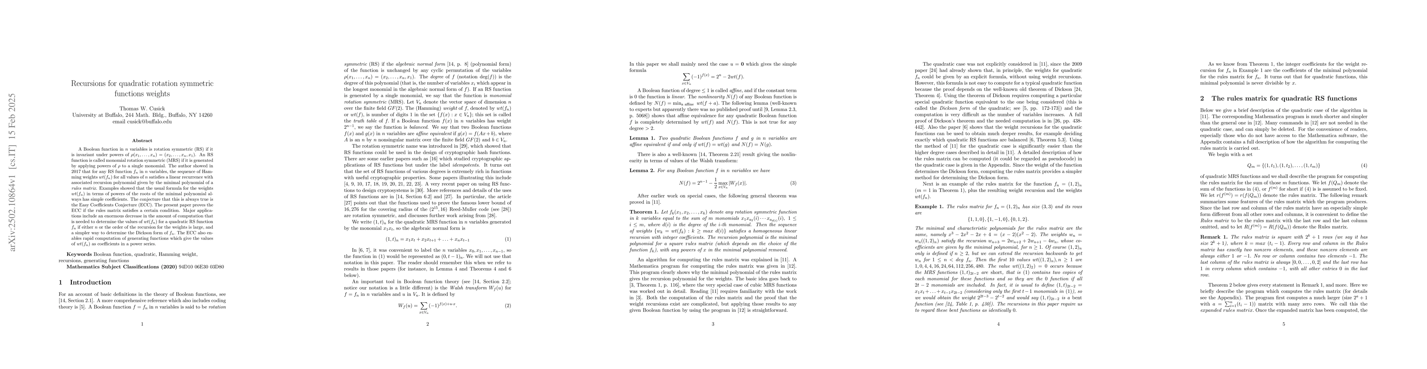 The paper presents a method to compute the rules matrix for quadratic rotation symmetric Boolean functions, leading to linear recursions for their Hamming weights with simple integer coefficients.