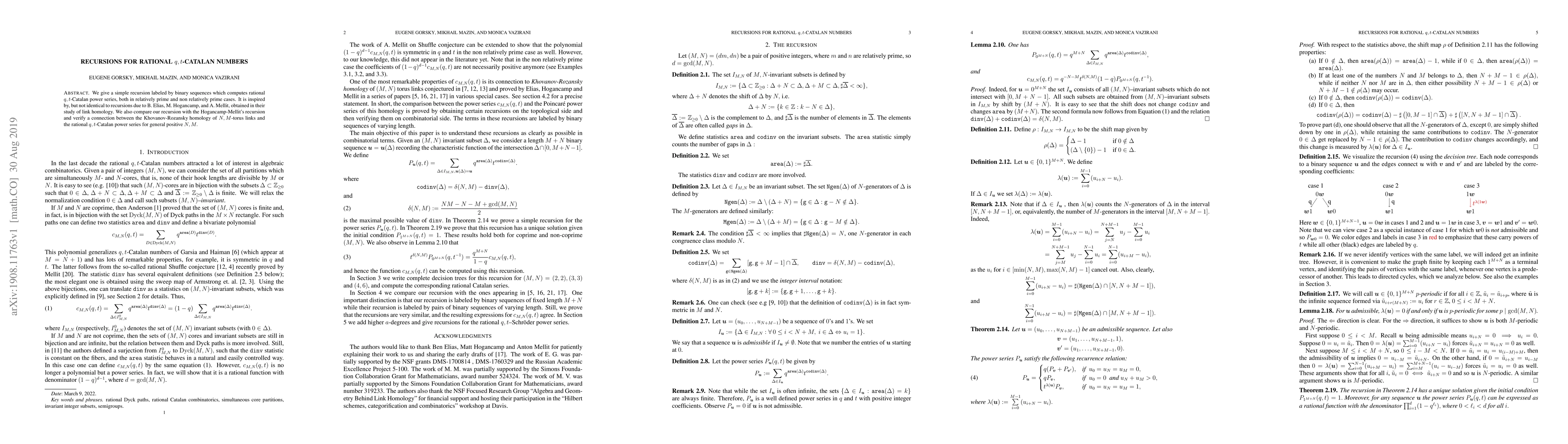 We give a simple recursion labeled by binary sequences which computes rational $q,t$-Catalan power series, both in relatively prime and non relatively prime cases. It is inspired by, but not identical to recursions due to B. Elias, M. Hogancamp, and A. Mellit, obtained in their study of link homology. We also compare our recursion with the Hogancamp-Mellit's recursion and verify a connection between the Khovanov-Rozansky homology of $N,M$-torus links and the rational $q,t$-Catalan power series for general positive $N,M.$