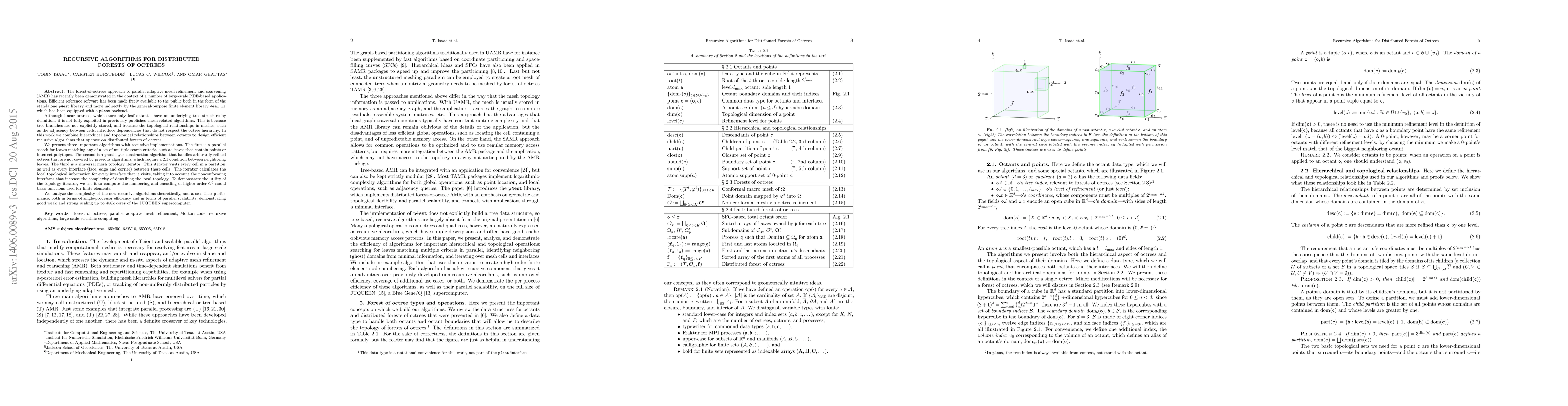 This paper introduces recursive algorithms for managing distributed forests of octrees, focusing on parallel search, ghost layer construction, and a universal mesh topology iterator. The algorithms exploit both hierarchical and topological relationships to enhance efficiency, and their performance is demonstrated to scale well on large supercomputers.