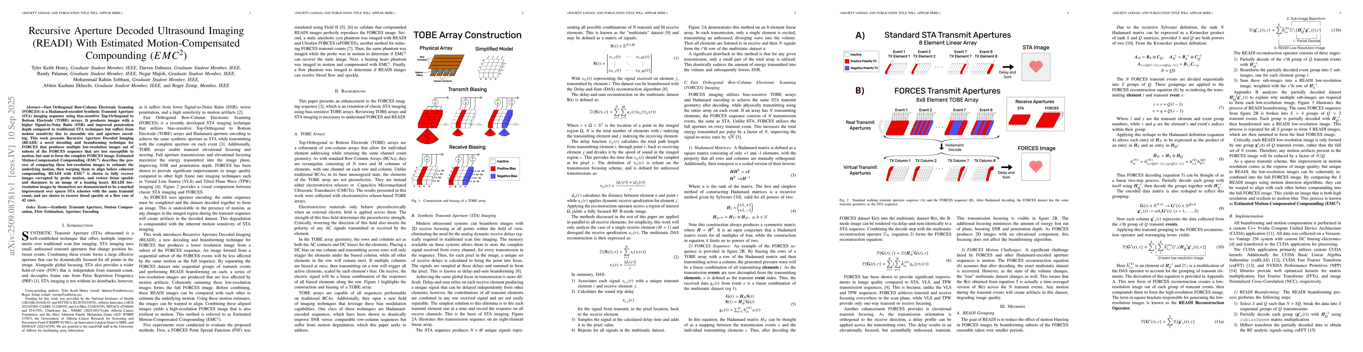 Fast Orthogonal Row-Column Electronic Scanning (FORCES) is a Hadamard-encoded Synthetic Transmit Aperture (STA) imaging sequence using bias-sensitive Top-Orthogonal to Bottom Electrode (TOBE) arrays. It produces images with a higher Signal-to-Noise Ratio (SNR) and improved penetration depth compared to traditional STA techniques, but suffers from motion sensitivity due to ensemble size and aperture encoding. This work presents Recursive Aperture Decoded Ultrasound Imaging (READI), a novel decoding and beamforming technique for FORCES that produces multiple low-resolution images out of subsets of the FORCES sequence that are less susceptible to motion, but sum to form the complete FORCES image. Estimated Motion-Compensated Compounding (EMC2) describes the process of comparing these low-resolution images to estimate the underlying motion, then warping them to align before coherent compounding. READI with EMC2 is shown to fully recover images corrupted by probe motion, and restore tissue speckle and sharpness to an image of a beating heart. READI low-resolution images by themselves are demonstrated to be a marked improvement over sparse STA schemes with the same transmit count, and are shown to recover blood speckle at a flow rate of 42 cm/s.