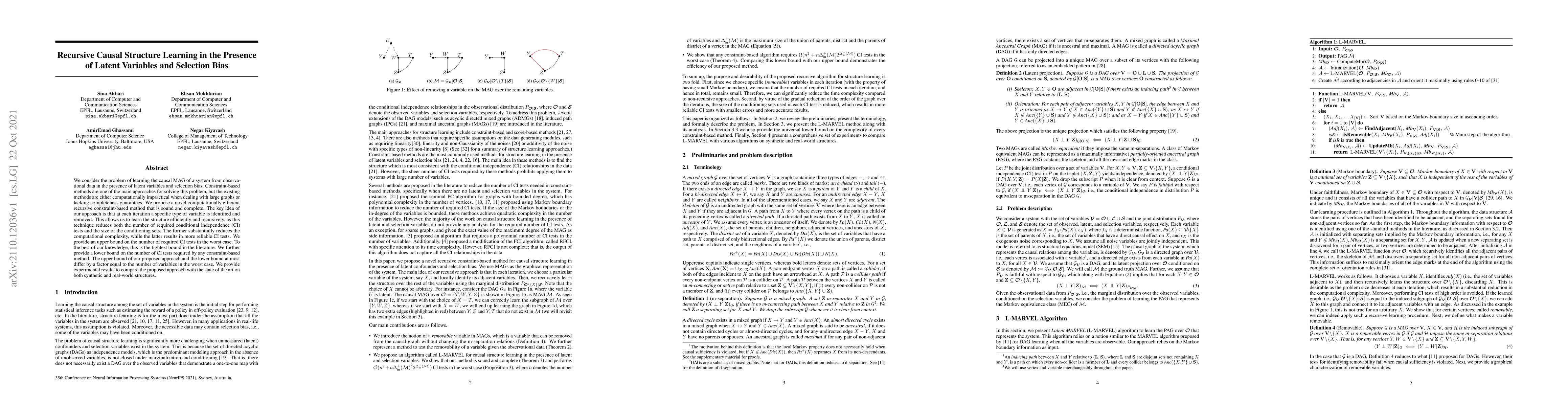 We consider the problem of learning the causal MAG of a system from observational data in the presence of latent variables and selection bias. Constraint-based methods are one of the main approaches for solving this problem, but the existing methods are either computationally impractical when dealing with large graphs or lacking completeness guarantees. We propose a novel computationally efficient recursive constraint-based method that is sound and complete. The key idea of our approach is that at each iteration a specific type of variable is identified and removed. This allows us to learn the structure efficiently and recursively, as this technique reduces both the number of required conditional independence (CI) tests and the size of the conditioning sets. The former substantially reduces the computational complexity, while the latter results in more reliable CI tests. We provide an upper bound on the number of required CI tests in the worst case. To the best of our knowledge, this is the tightest bound in the literature. We further provide a lower bound on the number of CI tests required by any constraint-based method. The upper bound of our proposed approach and the lower bound at most differ by a factor equal to the number of variables in the worst case. We provide experimental results to compare the proposed approach with the state of the art on both synthetic and real-world structures.