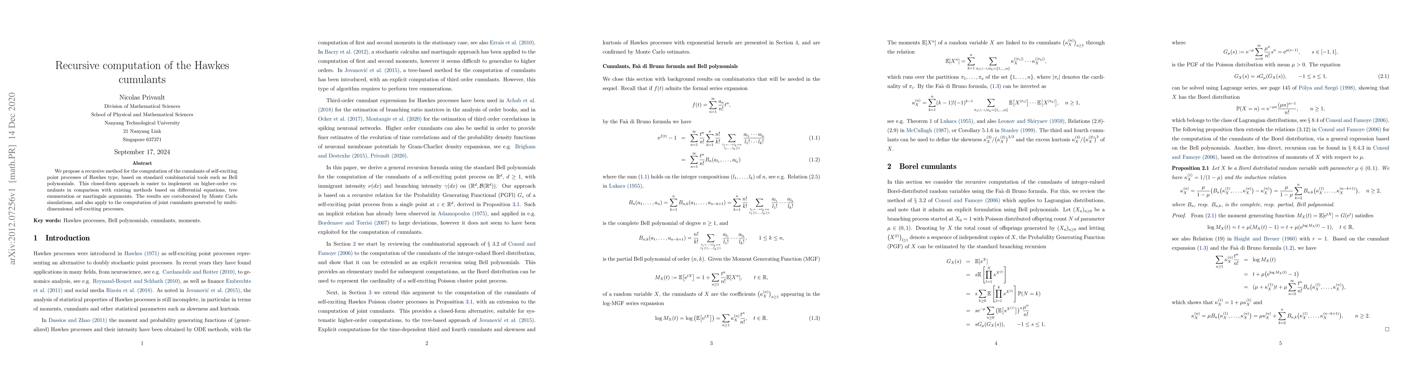 This paper introduces a recursive method for calculating the cumulants of Hawkes processes using Bell polynomials, offering a simpler, more implementable approach compared to existing techniques. The method is validated through Monte Carlo simulations and extends to joint cumulants in multidimensional self-exciting processes.
