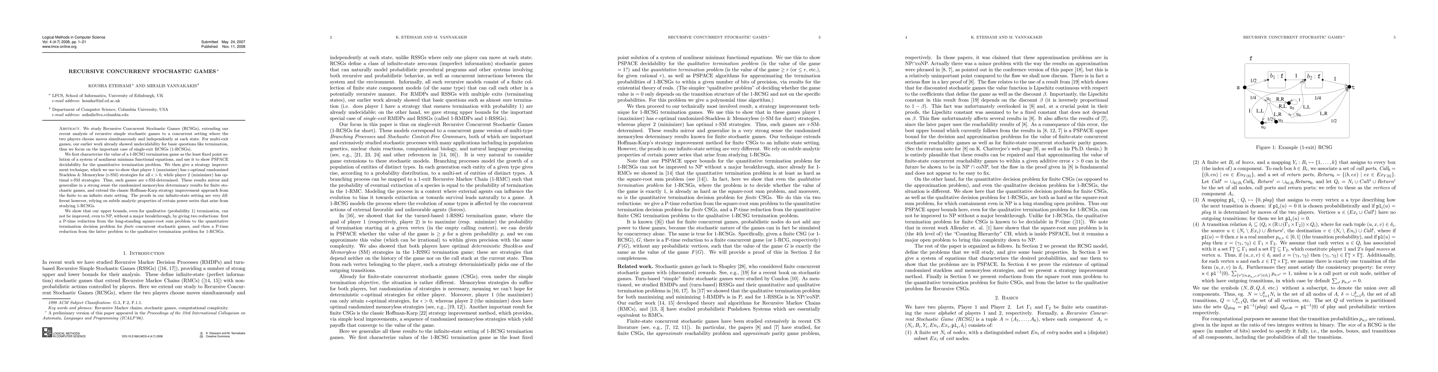This paper studies Recursive Concurrent Stochastic Games (RCSGs), focusing on single-exit games (1-RCSGs). It characterizes their value as the least fixed point solution of nonlinear minimax functional equations, proving PSPACE decidability for the quantitative termination problem and showing that 1-RCSGs are r-SM-determined. The study also establishes lower bounds on the complexity of solving these games, indicating that significant advancements are needed to improve upon current results.