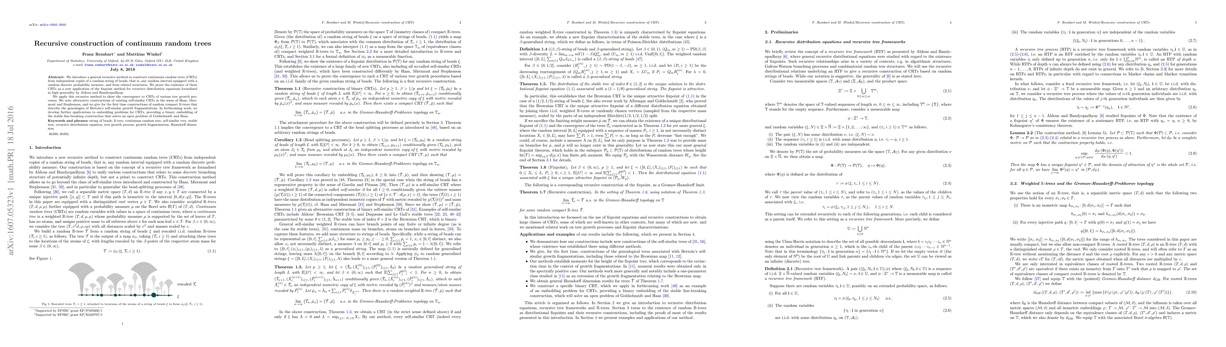 We introduce a general recursive method to construct continuum random trees (CRTs) from independent copies of a random string of beads, that is, any random interval equipped with a random discrete probability measure, and from related structures. We prove the existence of these CRTs as a new application of the fixpoint method for recursive distribution equations formalised in high generality by Aldous and Bandyopadhyay. We apply this recursive method to show the convergence to CRTs of various tree growth processes. We note alternative constructions of existing self-similar CRTs in the sense of Haas, Miermont and Stephenson, and we give for the first time constructions of random compact R-trees that describe the genealogies of Bertoin's self-similar growth fragmentations. In forthcoming work, we develop further applications to embedding problems for CRTs, providing a binary embedding of the stable line-breaking construction that solves an open problem of Goldschmidt and Haas.