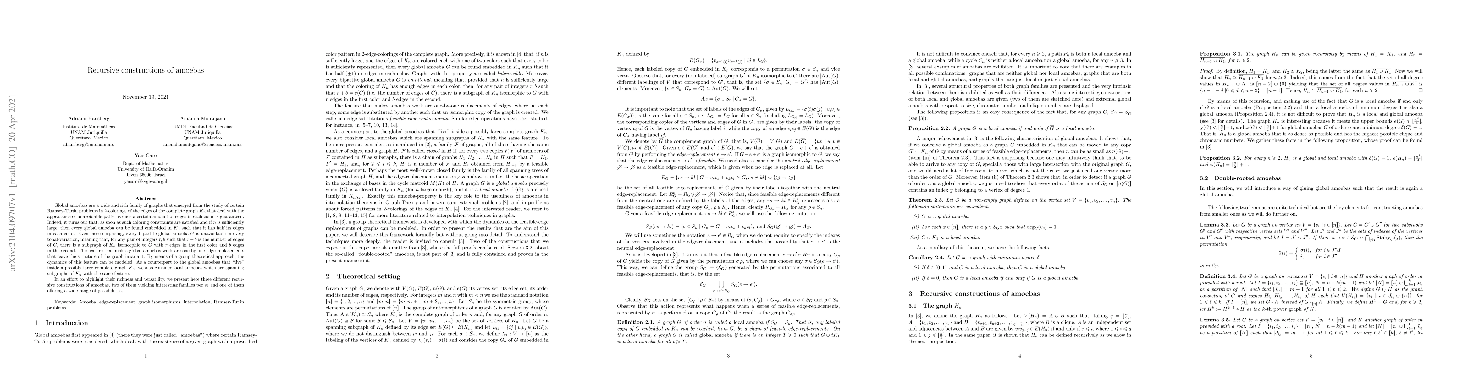 Global amoebas are a wide and rich family of graphs that emerged from the study of certain Ramsey-Tur\'an problems in $2$-colorings of the edges of the complete graph $K_n$ that deal with the appearance of unavoidable patterns once a certain amount of edges in each color is guaranteed. Indeed, it turns out that, as soon as such coloring constraints are satisfied and if $n$ is sufficiently large, then every global amoeba can be found embedded in $K_n$ such that it has half its edges in each color. Even more surprising, every bipartite global amoeba $G$ is unavoidable in every tonal-variation, meaning that, for any pair of integers $r, b$ such that $r + b $ is the number of edges of $G$, there is a subgraph of $K_n$ isomorphic to $G$ with $r$ edges in the first color and $b$ edges in the second. The feature that makes global amoebas work are one-by-one edge replacements that leave the structure of the graph invariant. By means of a group theoretical approach, the dynamics of this feature can be modeled. As a counterpart to the global amoebas that "live" inside a possibly large complete graph $K_n$, we also consider local amoebas which are spanning subgraphs of $K_n$ with the same feature. In an effort to highlight their richness and versatility, we present here three different recursive constructions of amoebas, two of them yielding interesting families per se and one of them offering a wide range of possibilities.