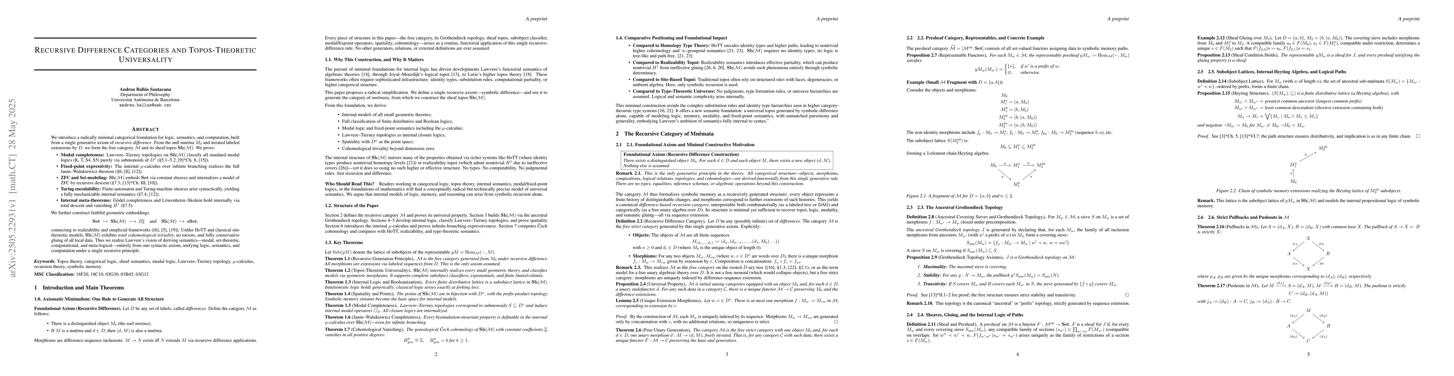The research introduces a minimal categorical foundation for logic, semantics, and computation based on a single generative axiom of recursive difference, constructing free category M and its sheaf topos Sh(M) from the null mnema M0 and iterated labeled extensions by D.