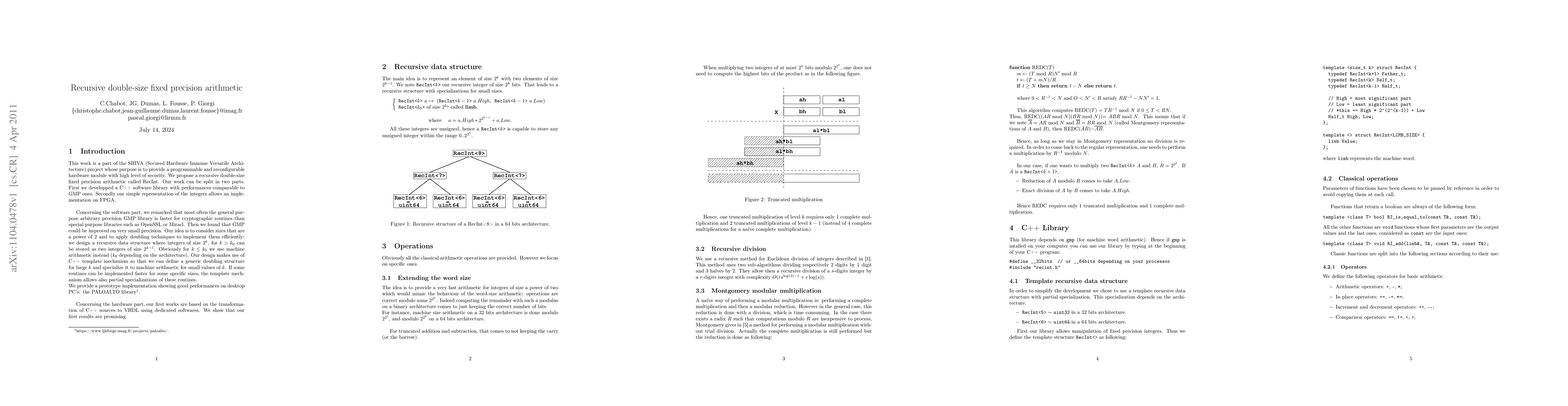 Researchers developed a recursive double-size fixed precision arithmetic called RecInt for high-security hardware, offering comparable performance to GMP libraries with efficient FPGA implementation.