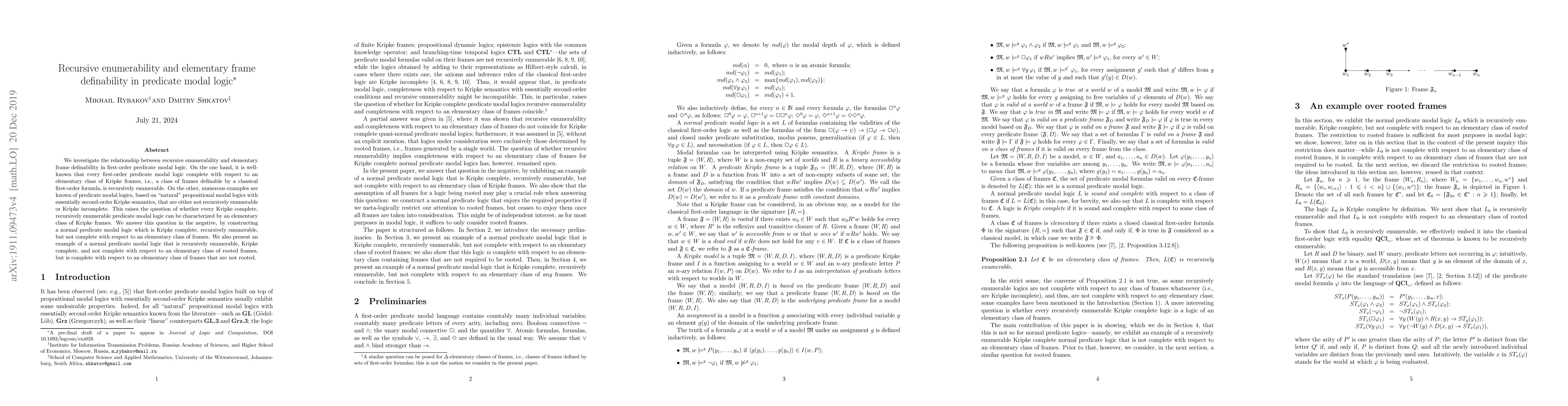 This paper explores the connection between recursive enumerability and elementary frame definability in first-order predicate modal logic, demonstrating that not all recursively enumerable, Kripke complete predicate modal logics are characterized by elementary frame classes. It constructs a counterexample to show this.