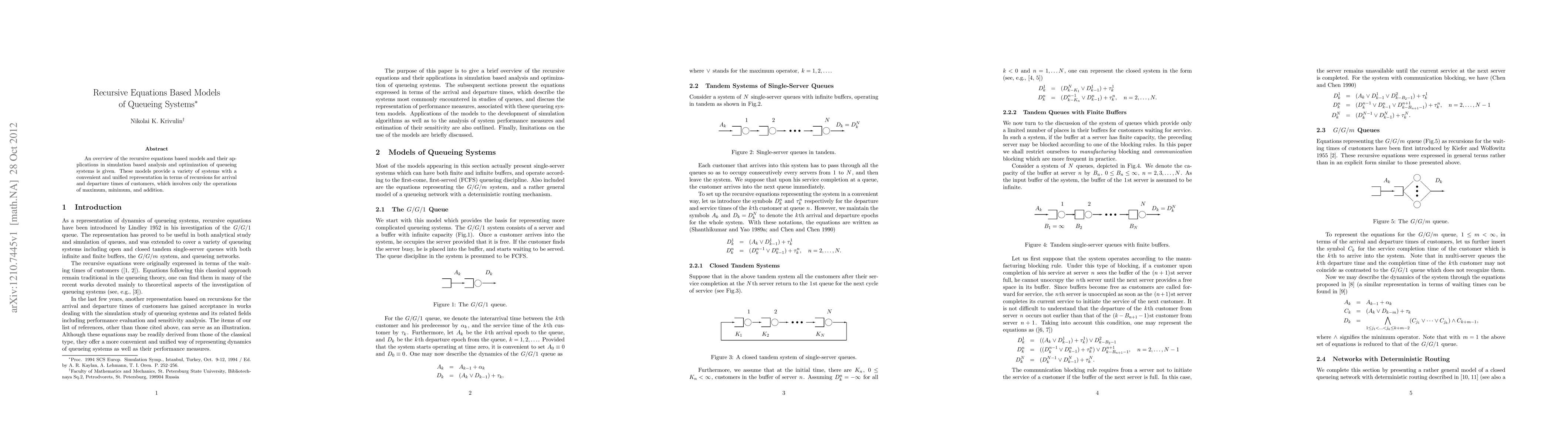 An overview of the recursive equations based models and their applications in simulation based analysis and optimization of queueing systems is given. These models provide a variety of systems with a convenient and unified representation in terms of recursions for arrival and departure times of customers, which involves only the operations of maximum, minimum, and addition.