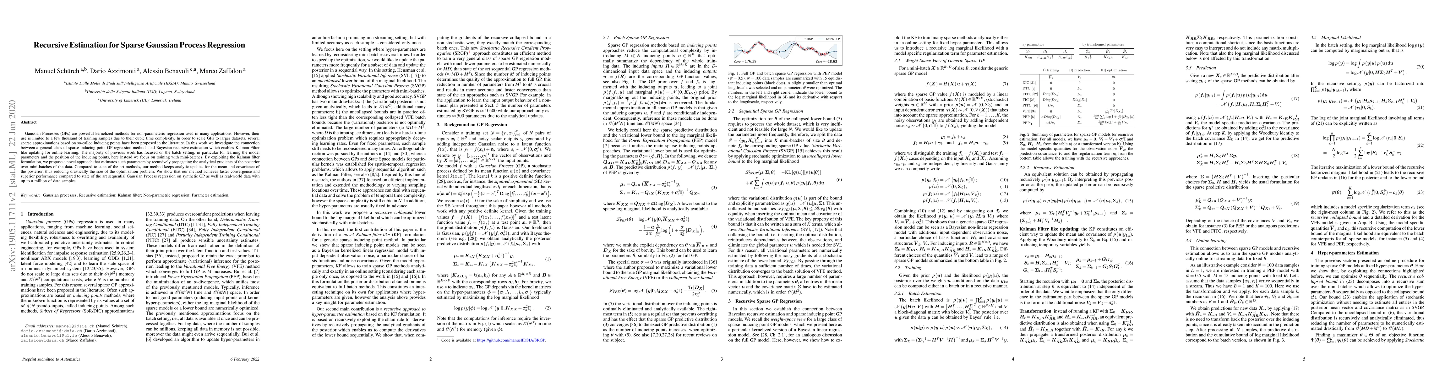 This paper proposes a recursive estimation method for sparse Gaussian Process Regression, enabling Kalman Filter-like updates for online learning. The approach estimates model parameters by analytically propagating gradients over mini-batches, achieving faster convergence and superior performance compared to existing methods on both synthetic and real-world datasets.