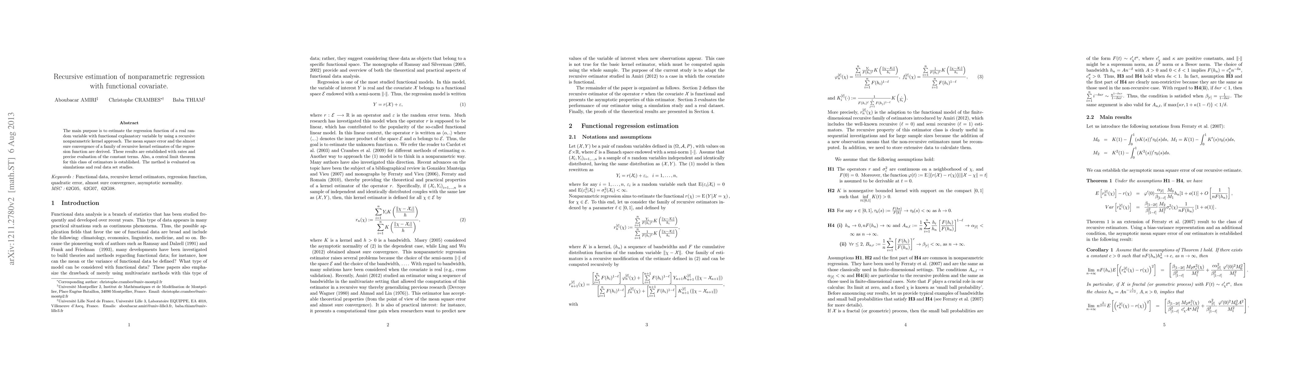 This paper proposes a recursive nonparametric kernel method for estimating regression functions with functional explanatory variables, deriving mean square error and convergence rates, and establishing a central limit theorem for the estimators. The method is validated through simulations and real data analyses.
