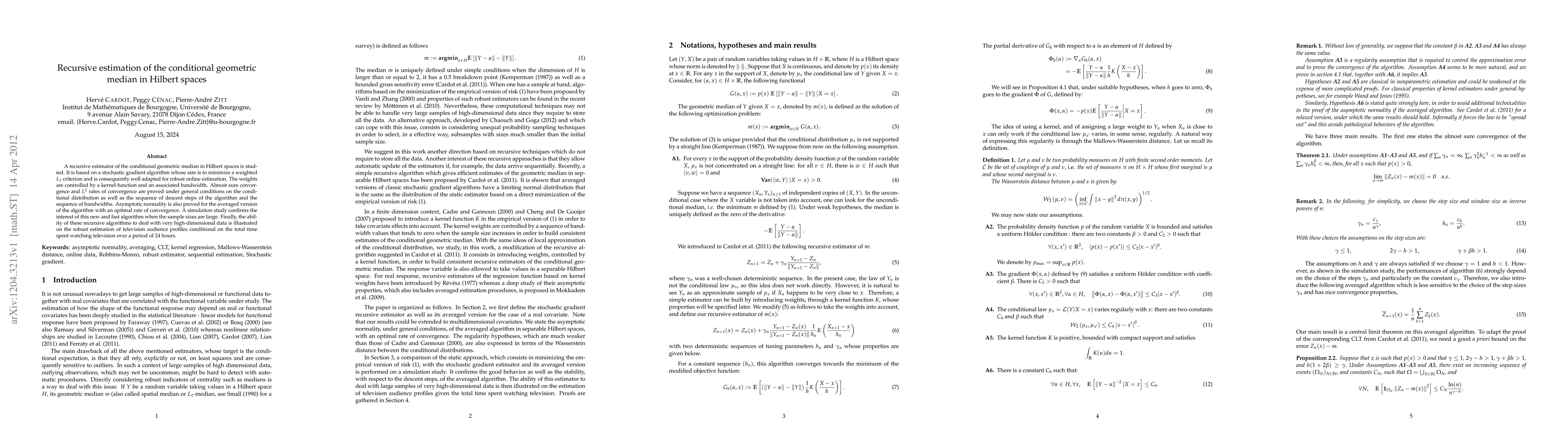 The paper proposes a novel recursive estimation method for the conditional geometric median in Hilbert spaces, supported by theoretical convergence proofs and empirical validation.